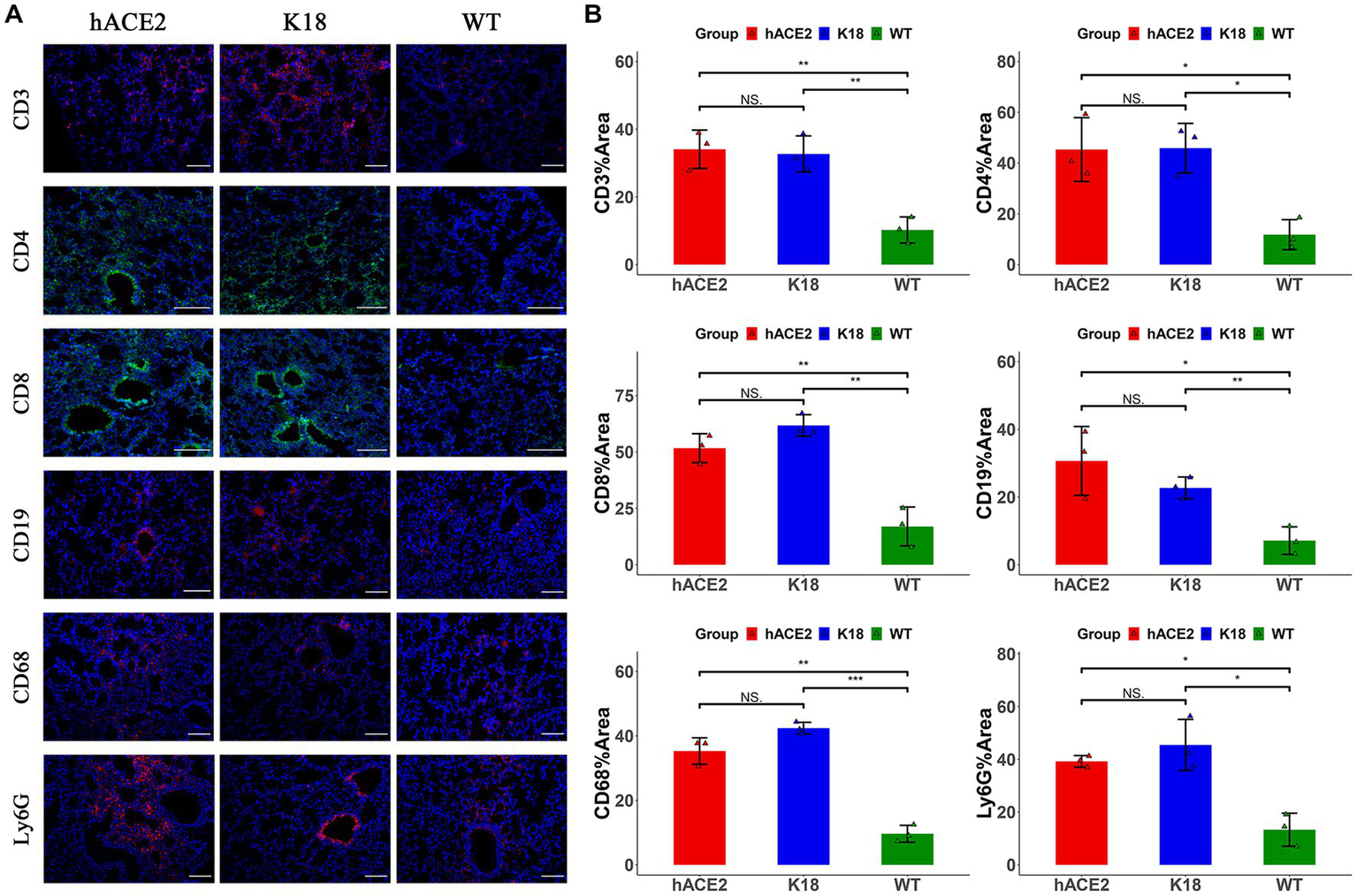 Figure 5. Characterization of immune responses in lungs of hACE2-KI mice infected with SARS-CoV-2. (A) Representative images of immunofluorescence staining analysis for the immune cells in lung tissues collected at 7 dpi. Cell markers: CD3, CD19, CD68, and Ly6G (red); CD4, CD8 (green). Scale bar: 100 μm. (B) Semi-quantitative analysis of area fraction of immune cells with immunofluorescence staining (n = 3 fields per group). Statistical analysis was performed using unpaired Student’s t-test or Wilcoxon rank test. NS: not significant; *p < 0.05; **p < 0.01; ***p < 0.001.