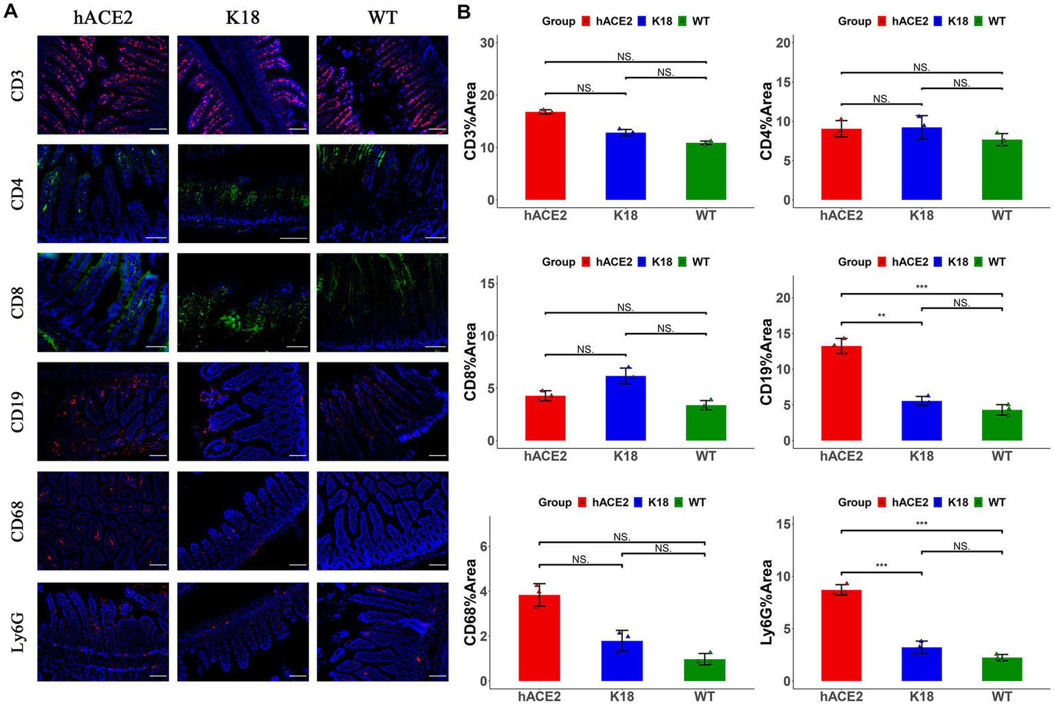 Figure 6. Characterization of immune responses in intestines of hACE2-KI mice infected with SARS-CoV-2. (A) Representative images of immunofluorescence staining analysis for the immune cells in intestinal tissues collected at 7 dpi. Cell markers: CD3, CD19, CD68, and Ly6G (red); CD4, CD8 (green). Scale bar: 100 μm. (B) Semi-quantitative analysis of area fraction of immune cells with immunofluorescence staining (n = 3 fields per group). Statistical analysis was performed using unpaired Student’s t-test or Wilcoxon rank test. NS: not significant; *p < 0.05; **p < 0.01; ***p < 0.001.