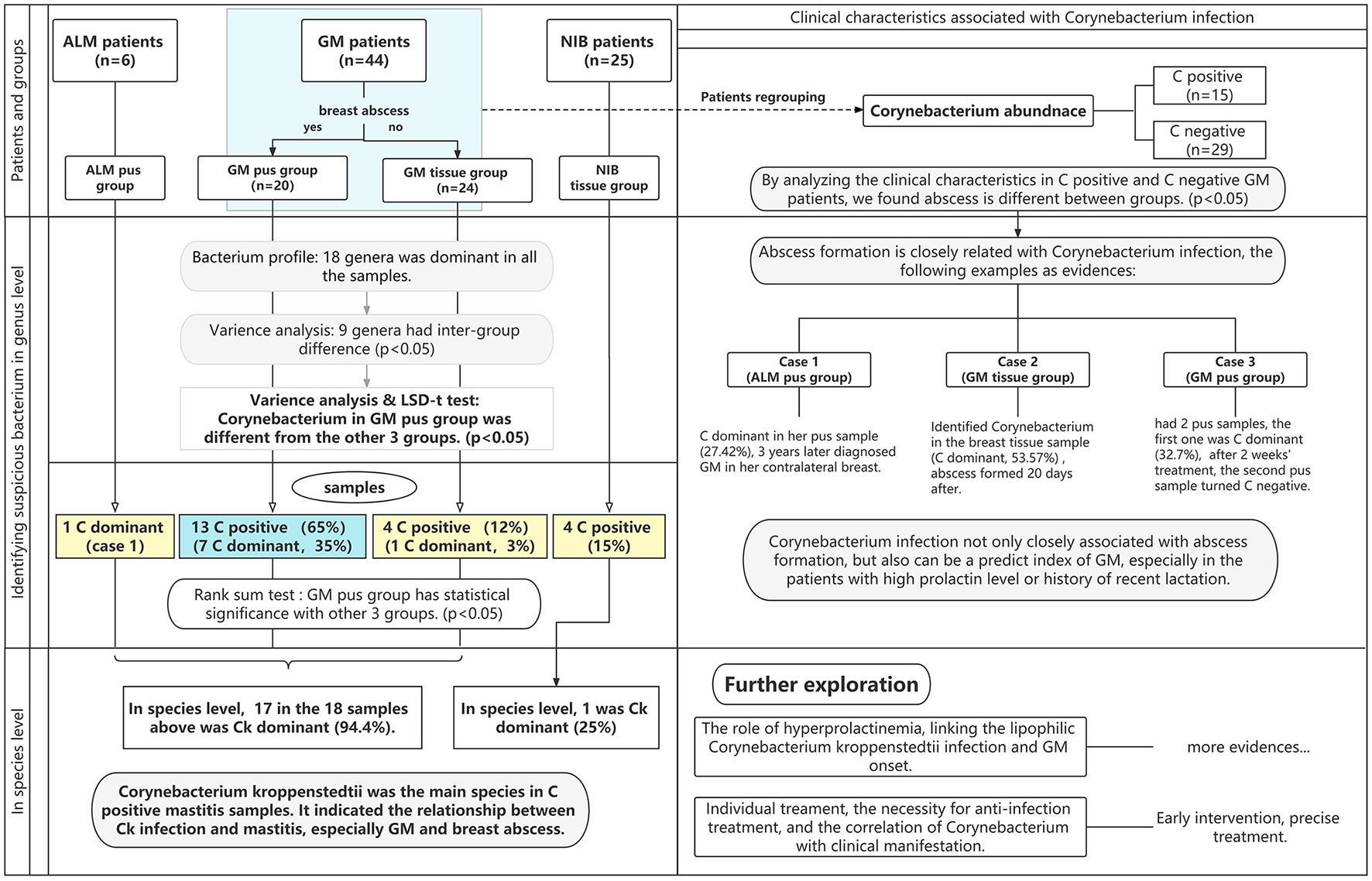 The flowchart of this study. The blue area represents the observation group, while the yellow areas represent the control group. Abbreviations: ALM, acute lactation mastitis; Ck, Corynebacterium kroppenstedtii; GM, granulomatous mastitis; NIB, non-inflammation breast disease. “C” is the abbreviation for Corynebacterium; C-dominant means the abundance of Corynebacterium is >10%, and C-positive means the abundance of Corynebacterium is >1%.