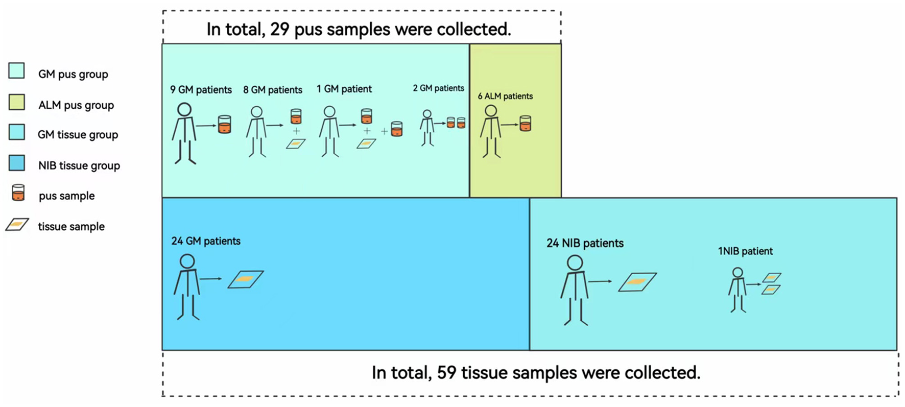 Among the 44 GM patients, 20 GM patients had breast abscesses; pus samples of all of these patients were taken, and tissue samples of nine patients were also collected. A total of 24 GM patients did not have an abscess, so only tissue samples were obtained from these individuals. All six ALM patients had breast abscesses, and we collected six pus samples from them. None of the 25 NIB patients had an abscess, so only their tissue samples were obtained. As shown in Figure 1, this study divided the patients into two pus groups (GM pus group and ALM pus group) and two tissue groups (GM tissue group and NIB tissue group). We obtained 29 pus samples and 59 tissue samples (patients with multiple samples are noted in Figure 2). During microbiota analysis, the ALM pus and NIB tissue groups were mainly used as control groups for the two GM groups.