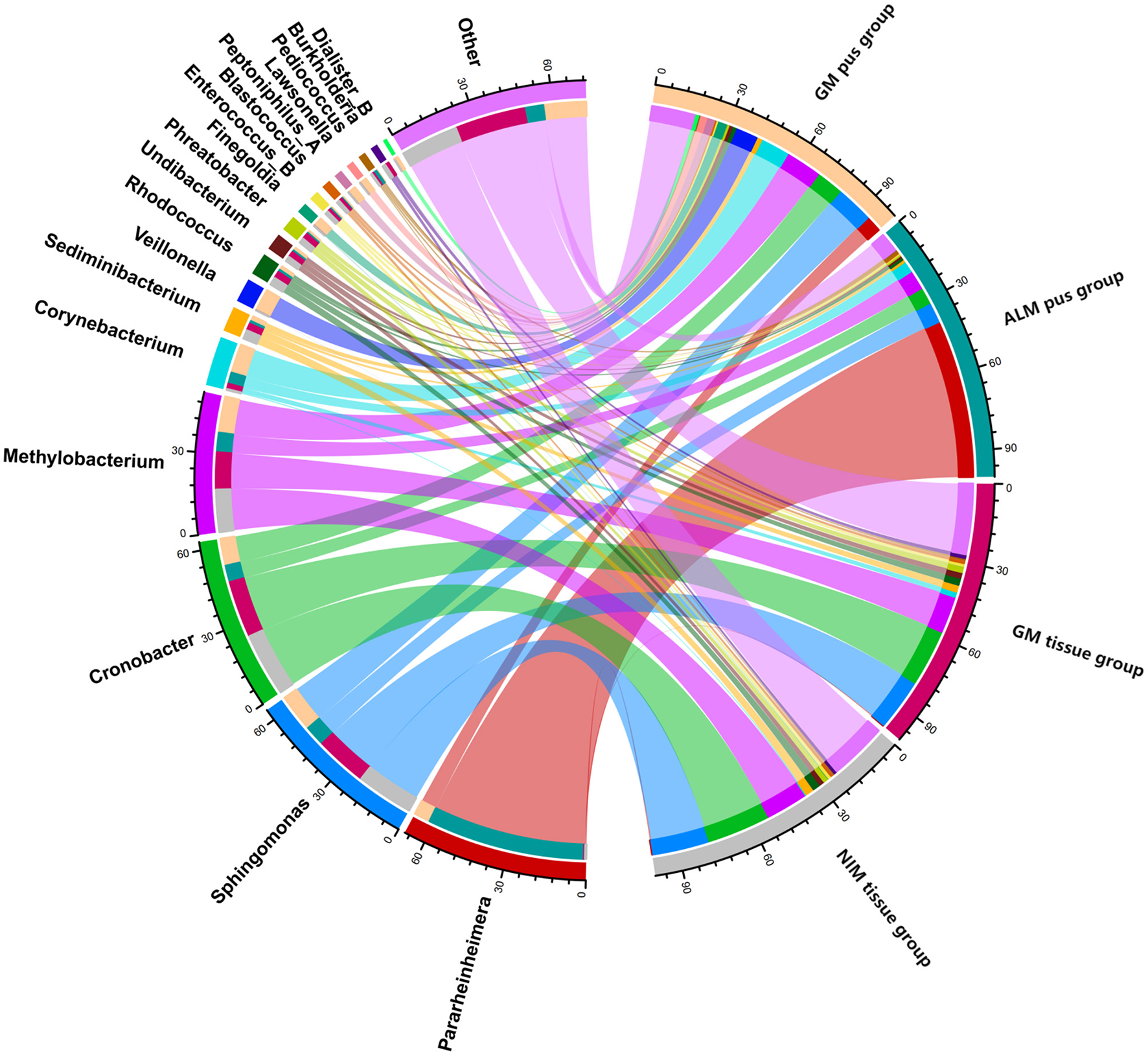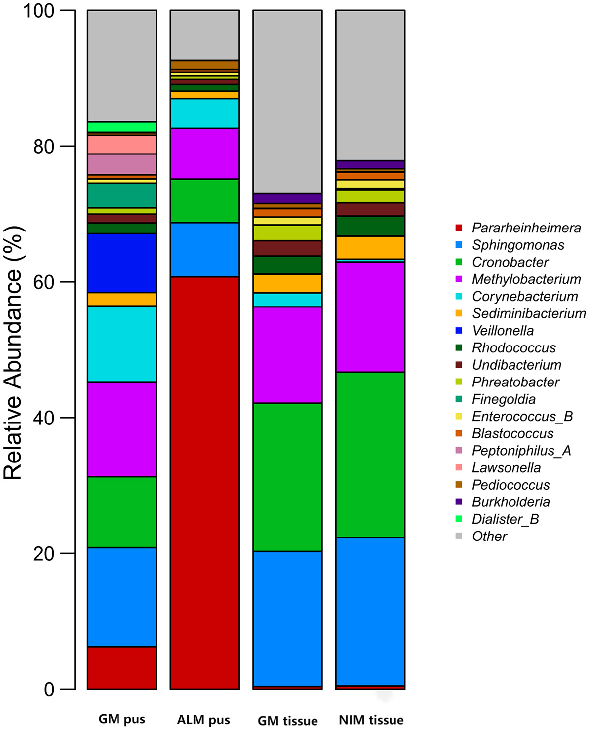 Table 2 shows the results of contributing bacteria in the four groups. All 18 genera we just mentioned were compared in these four groups, and nine genera had statistically significant differences. We further analyzed the nine genera with differences between groups, mainly focusing on the differences between the GM pus/tissue group and the other two groups. Eventually, we found that the genus Corynebacterium was the only bacterial genus with a significant difference between the GM pus group and the other three groups (Table 3). There was no significant difference between the GM tissue group and the two control groups (ALM pus group and NIB tissue group) (Table 4).