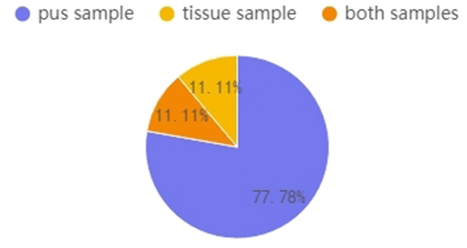 Pus samples were obtained by syringe negative-pressure aspiration, and tissue samples were obtained from puncture or surgery. All operations followed the aseptic principle, and samples were quickly transferred to sterile containers after sampling.