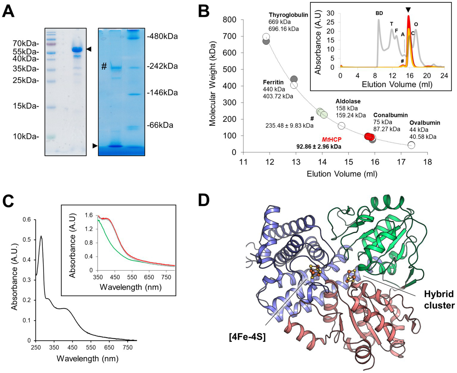 Oligomeric state, absorbance spectrum, and MtHCP overall structure. (A) SDS-PAGE (left) and high-resolution Clear Native PAGE (right) profiles of the enriched MtHCP fraction. About 3 μg of the sample kept frozen were loaded on gels. A black arrow indicates the position of MtHCP, and a “#” symbol marks the main contaminant of MtHCP. (B) Molecular weight estimation by size-exclusion chromatography. Protein standards (GE Healthcare, grey line in the insert) and three samples of MtHCP (deep red, red, and orange lines in the insert) are overlaid. The measured elution volume of the standard is plotted (grey dots, upper sizes), and the extracted exponential curve (y = 310753e−0.514x, R2 = 0.9927) was used for molecular weight estimation. The theoretical size of the standard proteins (white dots, smaller sizes) is given for reference. BD stands for blue dextran, T for thyroglobulin, F for ferritin, A for aldolase, C for conalbumin, and O for ovalbumin. (C) Absorbance spectra of MtHCP after freezing and storage at −80°C. The aerobic spectrum is coloured black in the main graph. Anaerobic measurements as isolated (red line), dithionite-reduced (green line), and ferricyanide-oxidised (grey line) are shown in the insert. (D) Overall structure of the MtHCP. The protein is presented in cartoon coloured by domains (N-terminal, central, and C-terminal domains being coloured blue, green, and red, respectively) with the clusters presented as ball and stick. Sulphur and iron are coloured yellow and orange, respectively.