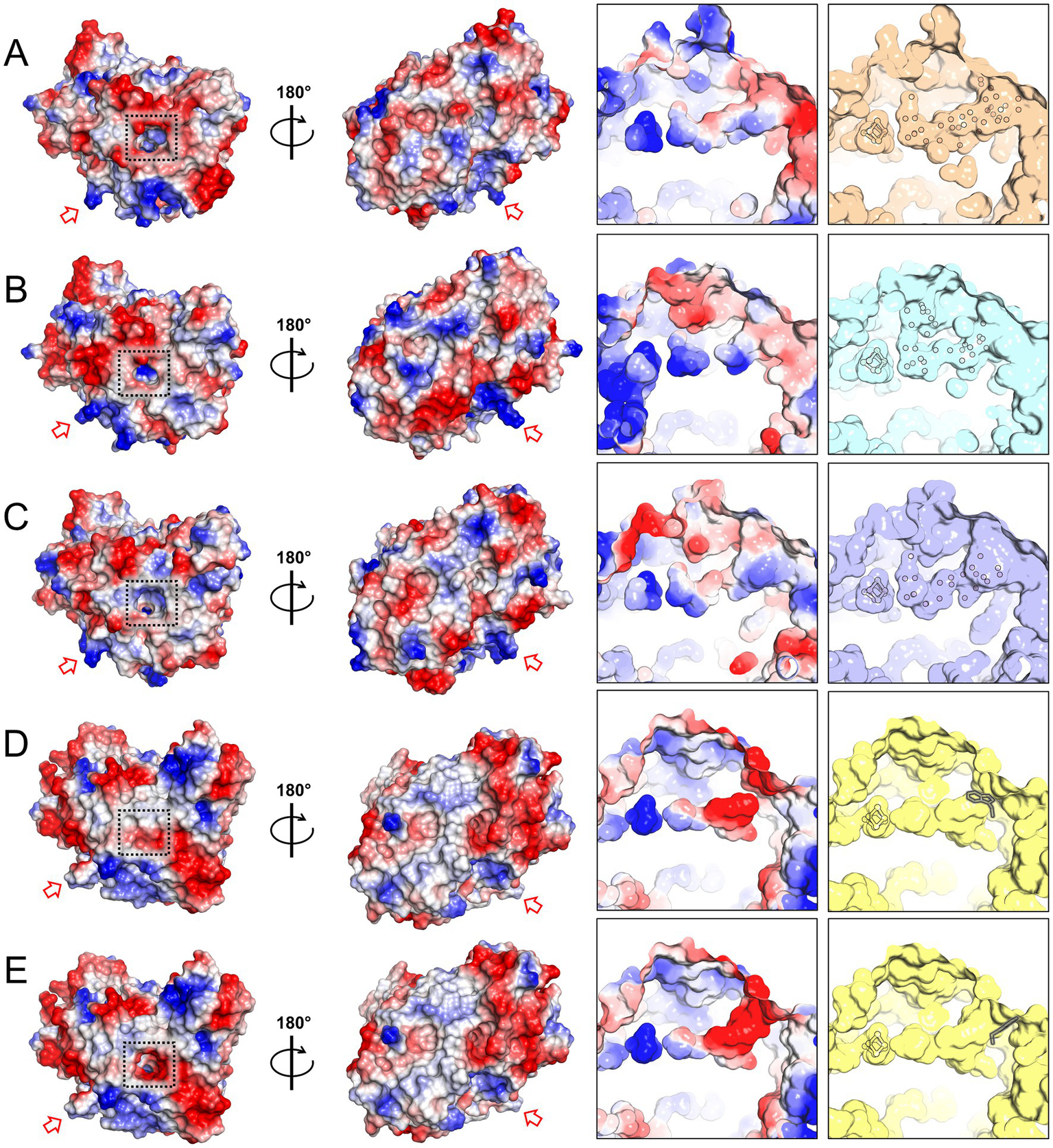 Charge distribution and access to the [4Fe-4S] cluster in HCP structures. (A–E) Charge distribution on the protein surface (left) and on the polar cavity near the cluster (right). Left: the proteins are shown in two orientations. A dashed black square highlights the entry of the polar cavities and the red arrow points to the loop proposed to interact with the partner in EcHCP and its equivalent in other structures. Right panel: surface of the polar cavity and filled water molecules. The water molecules, [4Fe-4S] cluster, and tryptophan 193 (framed in grey) of EcHCP are shown as balls and sticks. The structures presented are MtHCPred (PDB 8CNR, A), DdHCPred (PDB 1OA0, B), DvHCPred (PDB 1OA1, C), EcHCP (PDB 7DE4, D), and the EcHCP structure with a different conformation of tryptophan 193 (E).