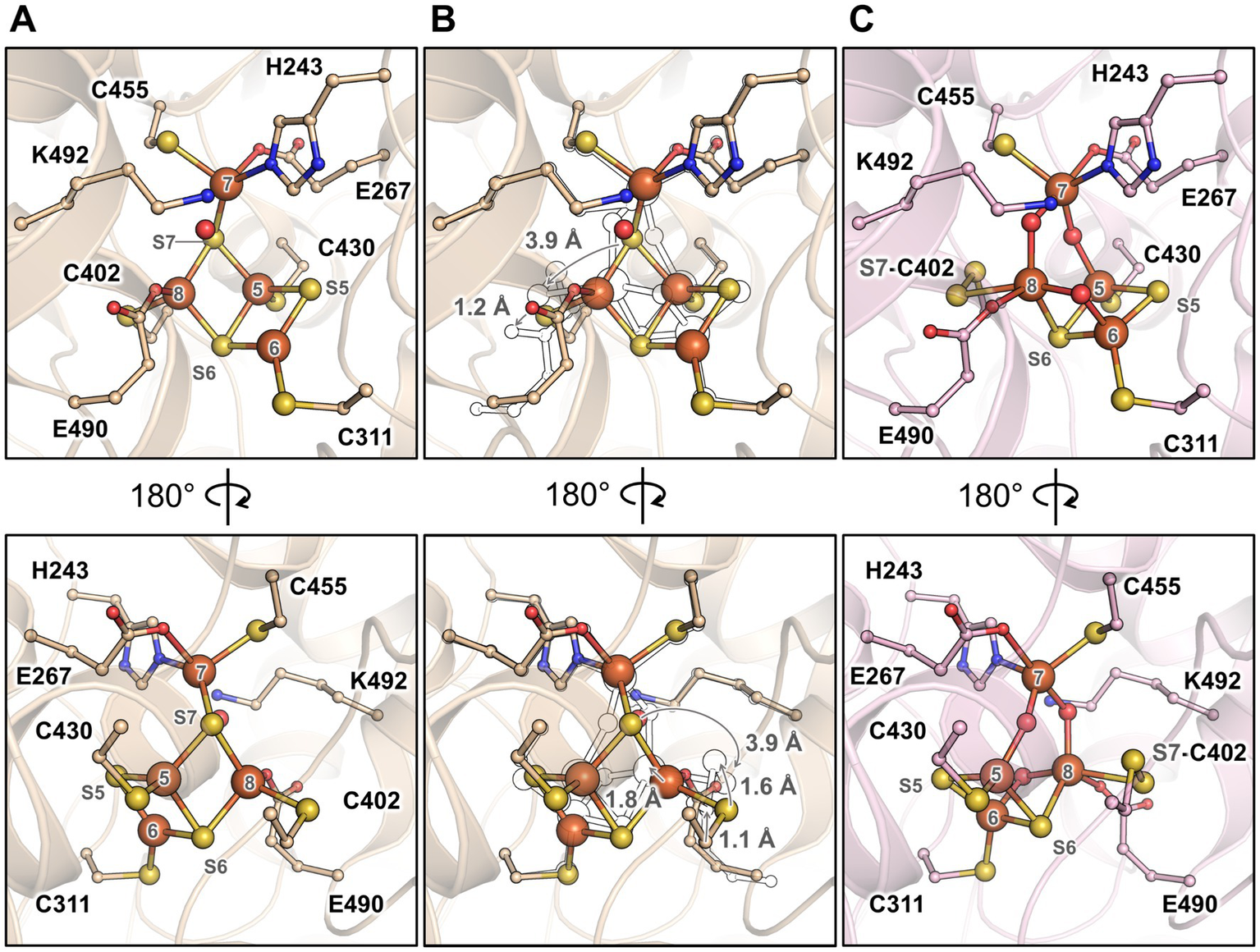 Transition of the hybrid cluster from reduced to oxidised/semi-oxidised state. (A) The reduced state structure MtHCPred. (B) Transition from the reduced to oxidised/semi-oxidised states. The structure of the reduced state (as shown in panel A) is overlaid with the oxidised/semi-oxidised state outlined in black and white. The proposed movement of the atoms is symbolised by arrows, except for movements below 1 Å. (C) The oxidised/semi-oxidised state of the hybrid cluster (MtHCPox extracted from MtHCPmix). The structures are represented in wheat (reduced state) and light pink (oxidised/semi-oxidised) transparent cartoon, with the cofactors and residues coordinating/interacting with the cluster being shown as balls and sticks. Oxygen, nitrogen, sulphur, and iron atoms are coloured red, blue, yellow, and orange, respectively. The atom numbering originates from (Hagen, 2022).