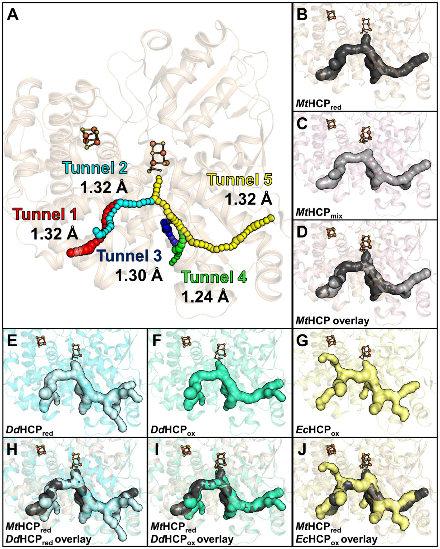 Channelling system in HCPs. (A) Tunnel analysis of MtHCPred by the CAVER programme. Spheres in different colours represent the tunnels predicted by the analysis, and the bottleneck radius is given in Ångström. (B–D) Prediction of the channelling system in MtHCP structures. (E–G) Prediction of the channelling system in DdHCPred (PDB 1OA0), DdHCPox (PDB 1GNL), and EcHCPox (PDB 7DE4) structures, respectively. (H–J) Superimposition of MtHCPred and bacterial structures and their channelling systems. (A–J) The structures are represented as transparent cartoons. (B–J) The predicted channelling systems are in surfaces with the clusters, and the coordinating cysteine 402 (MtHCP numbering) are presented in balls and sticks, with sulphur and iron coloured yellow and orange, respectively. The structures of MtHCPred, MtHCPmix, DdHCPred, DdHCPox, and EcHCPox are coloured wheat, light pink, light cyan, green cyan, and light yellow, respectively.