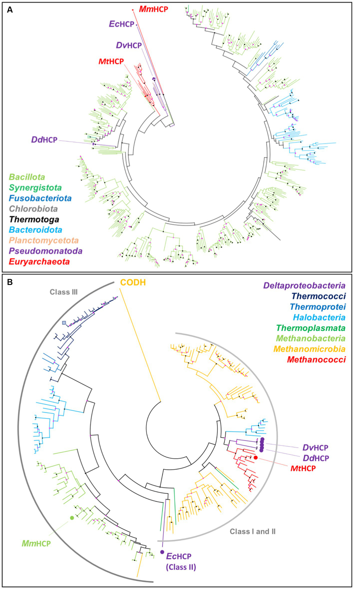 MtHCP position in the phylogenetic tree of HCPs. (A) HCP phylogenetic tree from the PDB (highlighted by a dot and labelled) and the 500 closest sequences to MtHCP from the RefSeq database. The branches are coloured by phylum. (B) HCP phylogenetic tree from the PDB (highlighted by a dot and labelled) and the 500 closest sequences to MtHCP from the RefSeq database, restricted to the Archaea domain. The branches are coloured by class. The sequence of P. furiosus is marked as a blue square. The labelled CODH is used as an outgroup. Node statistics (200 replicates) between 50–90 and 90–100 are represented by pink and black dots, respectively.