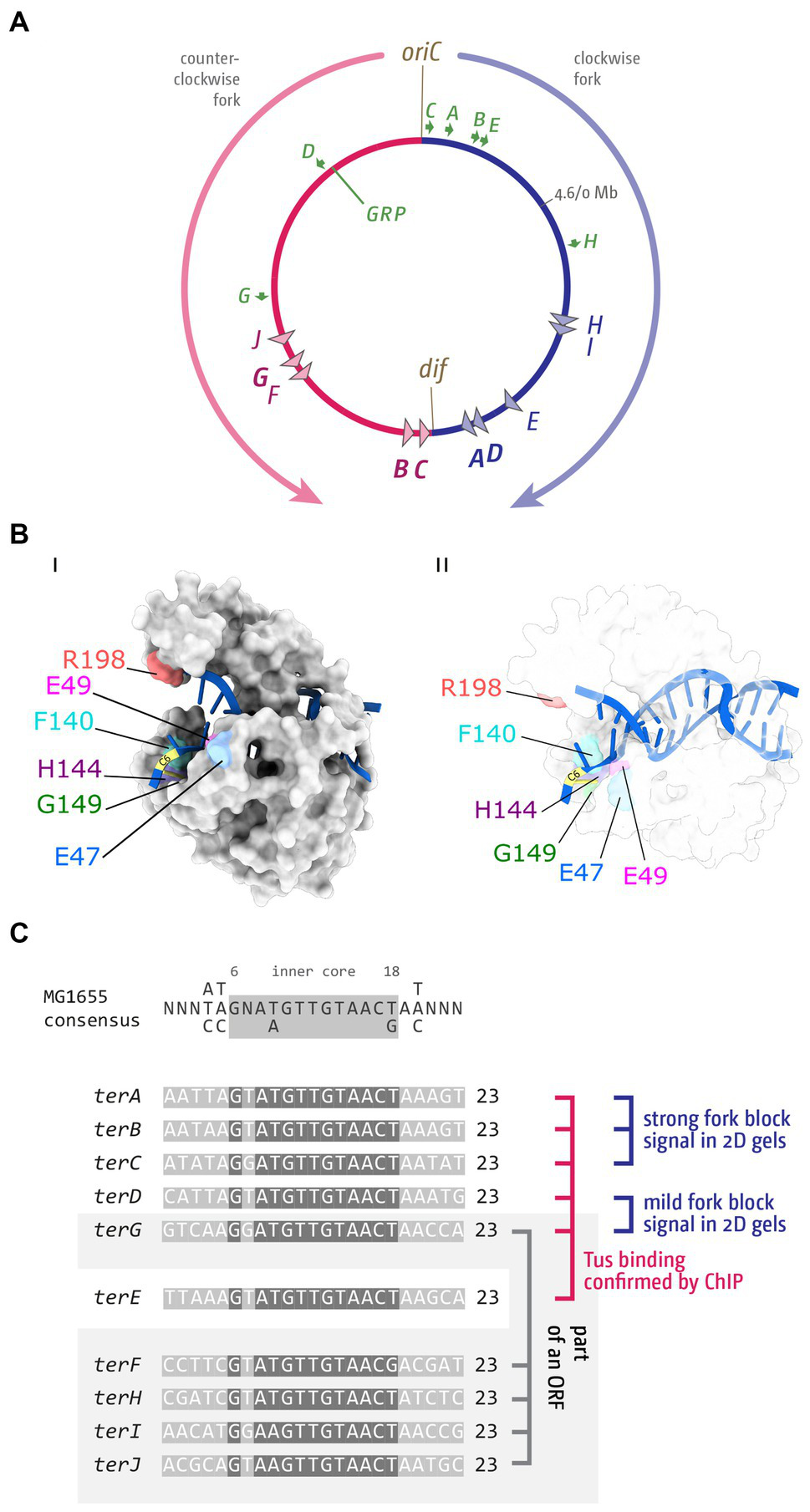 Figure 1. Chromosome structure and Tus-ter trap in Escherichia coli. (A) Schematic representation of the E. coli chromosome. Two replication forks are initiated at a single origin termed oriC and move in opposite directions along the DNA until they approach one another and fuse within the terminus region opposite oriC. A replication fork trap is formed in the terminus region via terminator sequences (terA–J) which are arranged as two opposed groups, with the pink terminators oriented to block movement of the clockwise replication fork and the blue terminators oriented to block the counter-clockwise fork. The locations of the dif chromosome dimer resolution site is marked. Locations of the rrn operons, which are particularly highly transcribed under fast growth conditions, are shown by green arrows, with the arrow pointing in the direction in which transcribing RNA polymerase molecules travel. ‘GRP’ indicates the location of a cluster of genes encoding ribosomal proteins, almost all of which are transcribed co-directionally with replication. (B) Structure of Tus-ter (PDB ID: 2I06) (Singleton et al., 2001). (Bi) Illustration of the “locked” conformation formed by DNA unwinding at the nonpermissive face. The cytosine base at position 6 of ter (C6), which flips into a specific binding site on the nonpermissive face of Tus to form the ‘lock’, is indicated, and important amino acid residues contributing to the locked conformation highlighted. (Bii) As above, but a transparent view is shown to allow easier visualisation of the DNA in general and the flipped C6 in particular. (C) Sequences of ter sites A–J from E. coli MG1655. The ter consensus sequence is shown at the top. Base pairs 1–5, 7, and 19–23 show a higher degree of variability and are shaded in a lighter grey. The highly conserved ter core (6, 8–18) is highlighted by a darker grey. Tus binding (Toft et al., 2021), in vivo fork blocking observed by 2D gel electrophoresis (Duggin and Bell, 2009) and analysis whether a ter site is part of an open reading frame (Duggin and Bell, 2009; Goodall et al., 2021) are indicated (see text for further details).
