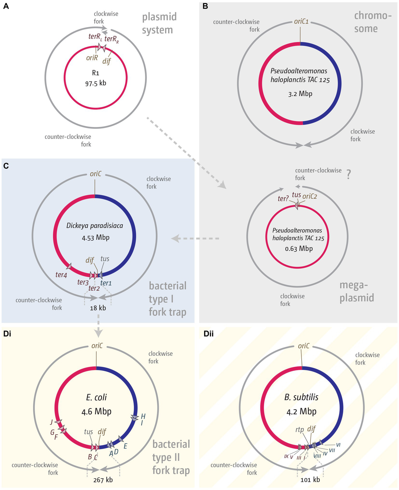 Figure 3. Comparison of fork trap systems in various plasmids and bacterial chromosomes. (A) Replication dynamics and fork trap system in the plasmid R1. (B) Replication and fork trap features of the primary and secondary chromosome in Pseudoalteromonas haloplanctis TAC 125. The secondary chromosome contains a tus gene, which is located next to the origin of replication, oriC2. The presence of a ter site is only implicated and therefore marked with a question mark. (C) Type I fork trap system in Dickeya paradisiaca, as described in Toft et al. (2022). (D) Type II fork trap system in E. coli (Di) and the fork trap system in Bacillus subtilis (Dii). See main text for further details.