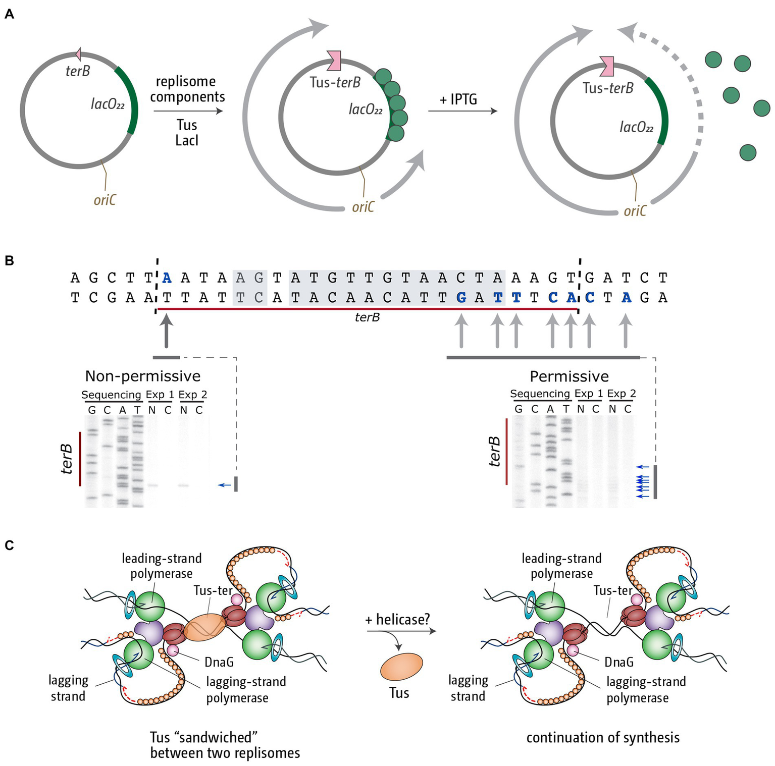 Figure 4. Replication fork fusion can be controlled in vitro to occur at Tus-terB. (A) pKJ1 replication assay template, indicating the location of replication initiation at oriC, the terB site and the lacO22 array. Replisome movement is shown pre (middle) and post (right) LacI-lacO block removal. (B) terB sequence indicating leading strand stop locations (bold and blue) and the Tus-binding site (shaded area). Mapping analysis of the leading strand products approaching Tus-terB in the non-permissive and permissive direction is shown below. Nicked products (stop sites) are indicated by arrows. Mapping data were reproduced from Jameson et al. (2021). (C) Schematic representation of the termination intermediates generated by a fork fusion event taking place at Tus-terB. We believe the most likely candidate for the removal of Tus from this super-complex in vivo is an as yet unidentified helicase.