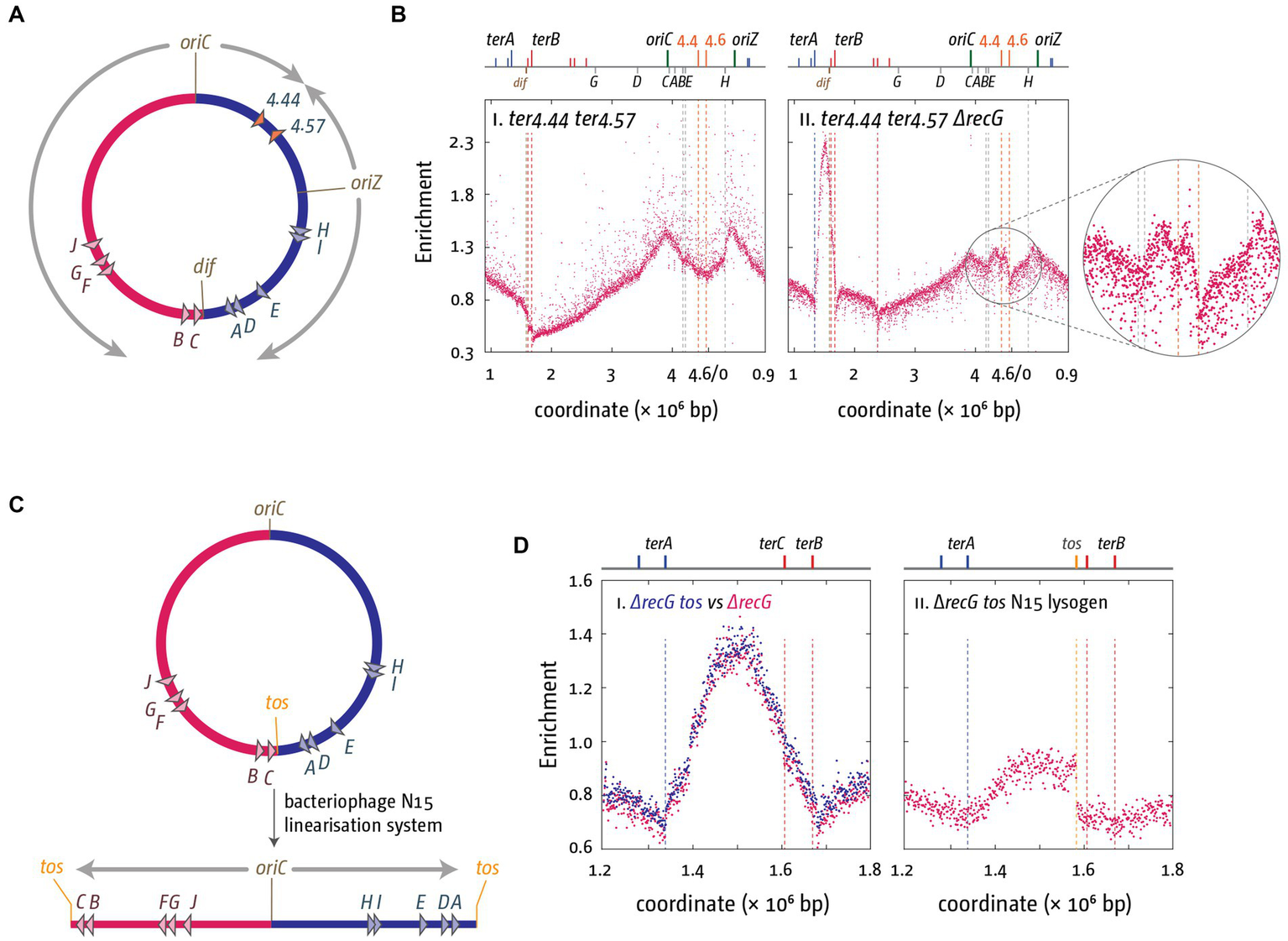 Keywords: termination of DNA replication, DNA replication, DNA segregation, RecG helicase, Tus-ter complexes, bacterial chromosome dynamics, chromosomal architecture