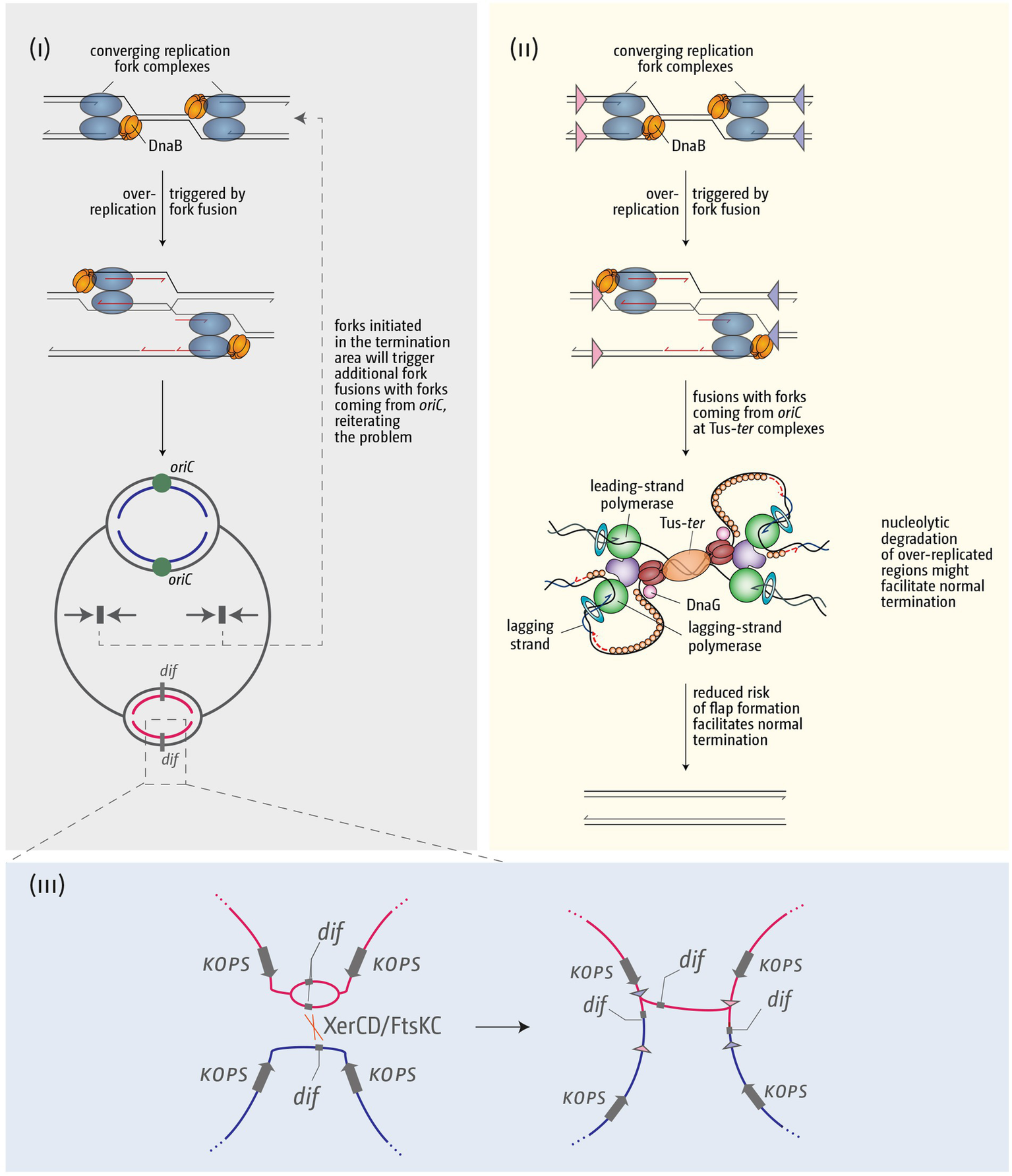 Figure 7. Schematic illustrating how over-replication triggered by replication fork fusions might trigger problems for chromosome duplication and segregation, and how the presence of a fork trap area might help in resolving these issues. (i) Over-replication triggered in the termination area by fork fusion reactions will result in additional collisions with forks coming from oriC, thereby reiterating and exacerbating the problem. (ii) A fork fusion reaction by a freely moving fork encountering a second stably arrested at a Tus-ter complex is less likely to result in formation of a 3’ flap and subsequent over-replication, thereby facilitating successful termination. (iii) If termination induces over-replication and the chromosome dimer resolution site dif is duplicated, this can lead to problems of the chromosome dimer resolution mechanism. See text for further details.