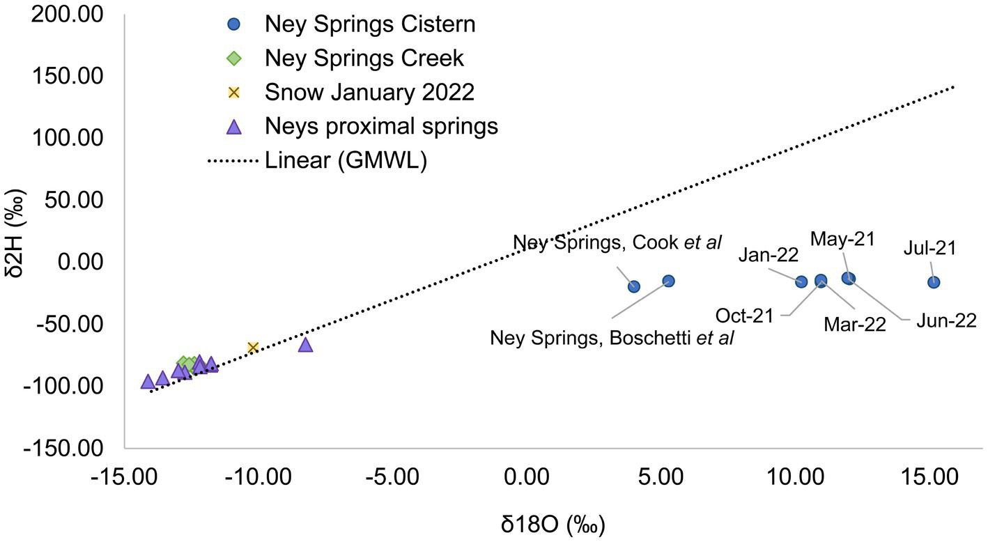 Water isotope plot showing Ney Springs cistern samples collected seasonally compared to surface water proximal springs, Ney Springs Creek, snow melt, and the global meteoric water line. Samples are differentiated by color and shape.