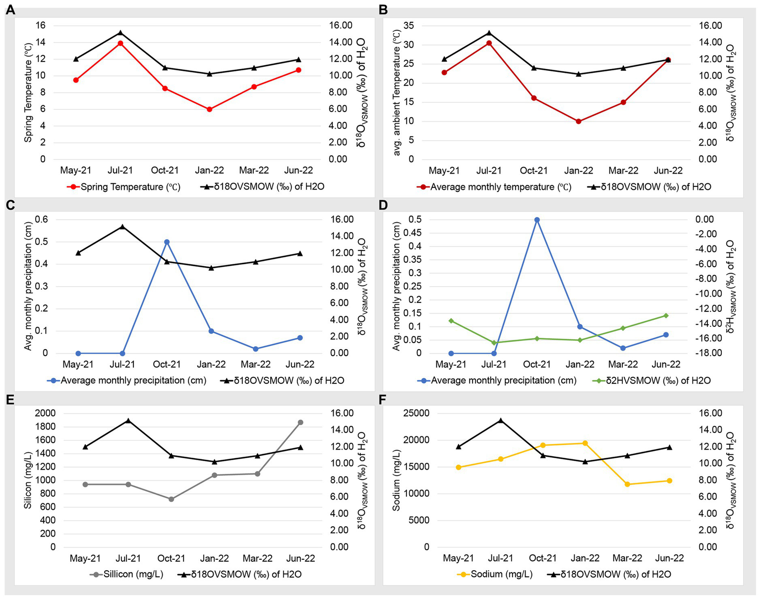 Geochemistry and water isotope time series plots. Plots consists of two Y axes, with data points listed in chronological order on the X axis. Panels are as follows: (A) Ney Springs cistern fluid temperature compared to δ18O (‰ VSMOW) of H2O. (B) Average ambient monthly temperature for greater Ney Springs area compared to δ18O (‰ VSMOW) of H2O. (C) Average monthly precipitation for greater Ney Springs area compared to δ18O (‰ VSMOW) of H2O. (D) Average monthly precipitation for greater Ney Springs area compared to δ2H (‰ VSMOW) of H2O. (E) Silicon concentration in Ney Springs cistern (mg/L) compared to δ2H (‰ VSMOW) of H2O. (F) Sodium concentration in Ney Springs cistern (mg/L) compared to δ2H (‰ VSMOW) of H2O.