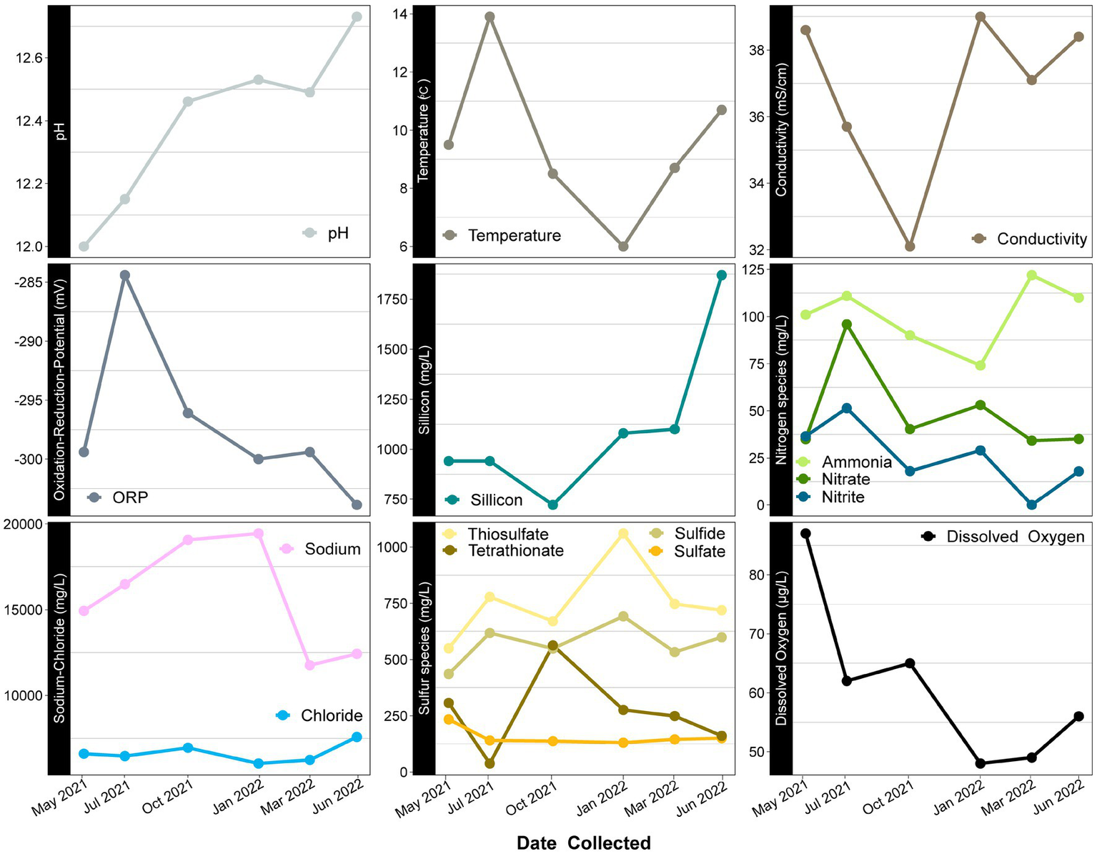 Temporal variation is also observed in several redox active geochemical constituents, such as sulfur and nitrogen species. These species are more liable to be altered by microbial processes, and their variation may suggest that microbial community dynamics are driving changes that may or may not be related to other environmental parameters that change seasonally (i.e., temperature). In this system, sulfate is predicted to come from the connate nature of the deeper ground waters being influenced by the marine Franciscan subduction complex. It has previously been speculated that the sulfide present in the spring is potentially a product of microbial sulfate reduction, as it is not volcanic in nature (Feth et al., 1961). However, sulfur oxidation, which was previously shown to be a viable metabolism in this system, could also impact sulfate/sulfide concentrations (Trutschel et al., 2022). Interestingly, the balance of sulfur species changes over the course of our year sampling period. The abundance of sulfide vs. oxidized products supports the influence of microbial activity (Figure 4). While this change may be occurring at the surface level, deeper subsurface microbial activity and/or water-rock interactions could be influencing the sulfur species composition as well.