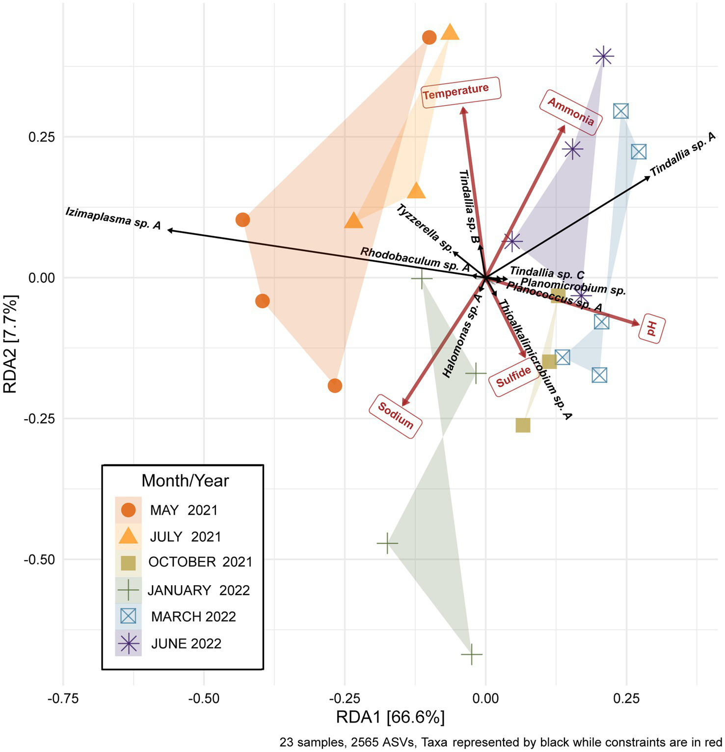 In addition to determining sampling periods’ associations with specific ASVs, a redundancy analysis (RDA) was performed to determine how much seasonal variation within the microbial community may be explained by changes in geochemistry. Constrained elements were chosen based on their seasonal variation, potential for interaction with microbial metabolism, and on their unrelatedness to one another. These parameters included pH, temperature, sodium, ammonia, and sulfide. The five independent constrained variables explained 74.3% of the variation seen between the microbial community samples (Figure 5). This revealed several potential relationships between core community taxa and constrained elements associated with metabolism, such as Tindallia spp. with ammonia as well as Thioalkalimicrobium sp. A, and Halomonas sp. A with sulfide. Meanwhile, changes in pH, sodium, and temperature may cause a shift in favorable growth conditions for multiple core community members in a way that broadly alters structure. This could also explain why certain sampling periods are associated more closely with these parameters (e.g., sodium with January 2022).