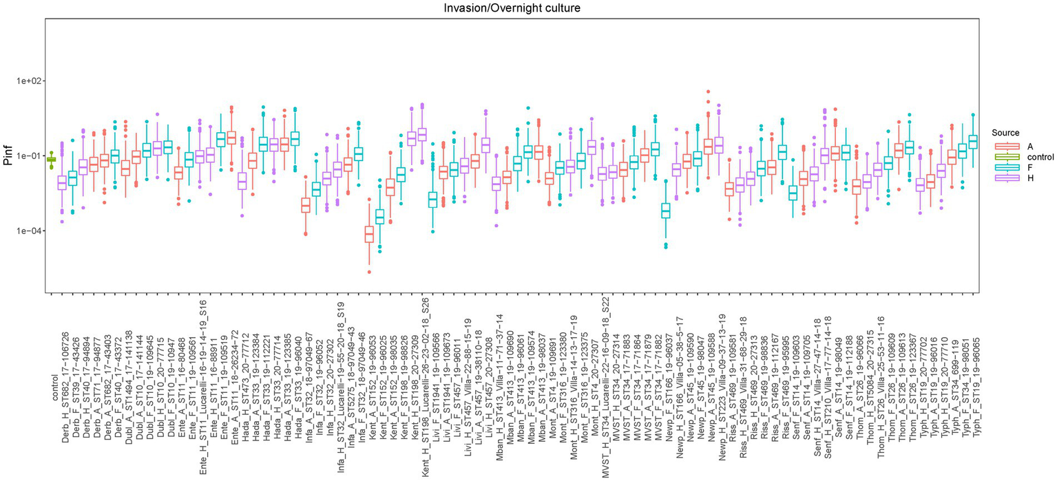 Box plots of the P(inf) values estimated with the Bayesian model for all tested isolates, sorted by serovars, are shown in Figure 2, while the measured P(inf) values from the GIT system are reported in Supplementary Table S2. A degree of variability existed between the tested strains, with a S. Kentucky isolate from an animal source having the lowest average P(inf), 6.7E-05, and an S. Kentucky strain from a human source having the highest average P(inf), 5.2E-01. At the serovar level, individual isolates displayed a wide range of P(inf) values, except for S. Hadar, for which most of the isolates (4 out of 6) showed similar in vitro virulence behavior, with P(inf) values being 51 to 55% lower than the P(inf) of the most virulent strain (Figure 2; Supplementary Table S2). Also S. Dublin showed small differences in P(inf) for the individual strains, with P(inf) values ranging from 1.93E-02 to 1.8E-01, corresponding to a variation of maximum 11% within S. Dublin strains, while S. Kentucky, S. Newport and S. Typhimurium displayed larger differences in P(inf).
