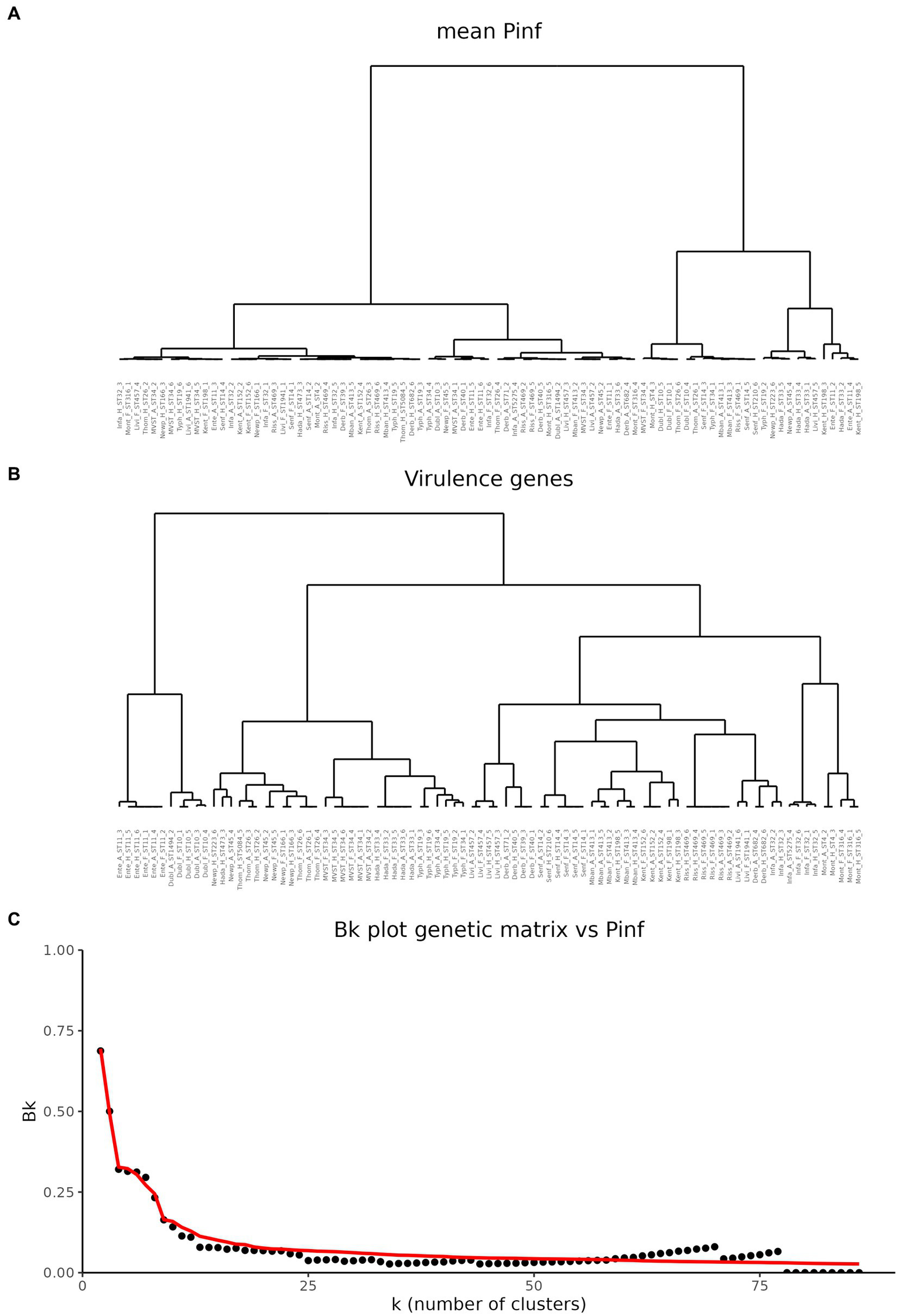 Comparison of hierarchical cluster trees. (A) Cluster tree based on the mean values of P(inf). (B) Cluster based on the matrix of virulence genes. (C) Comparison of the two cluster trees based on the Bk statistics. Black dots represent the Bk values plotted against the k number of clusters in which the dendrogram has been portioned. Red line represents the one-sided rejection region based on the asymptotic distribution of Bk for each value of k under the null hypothesis of no relation between the clusters.