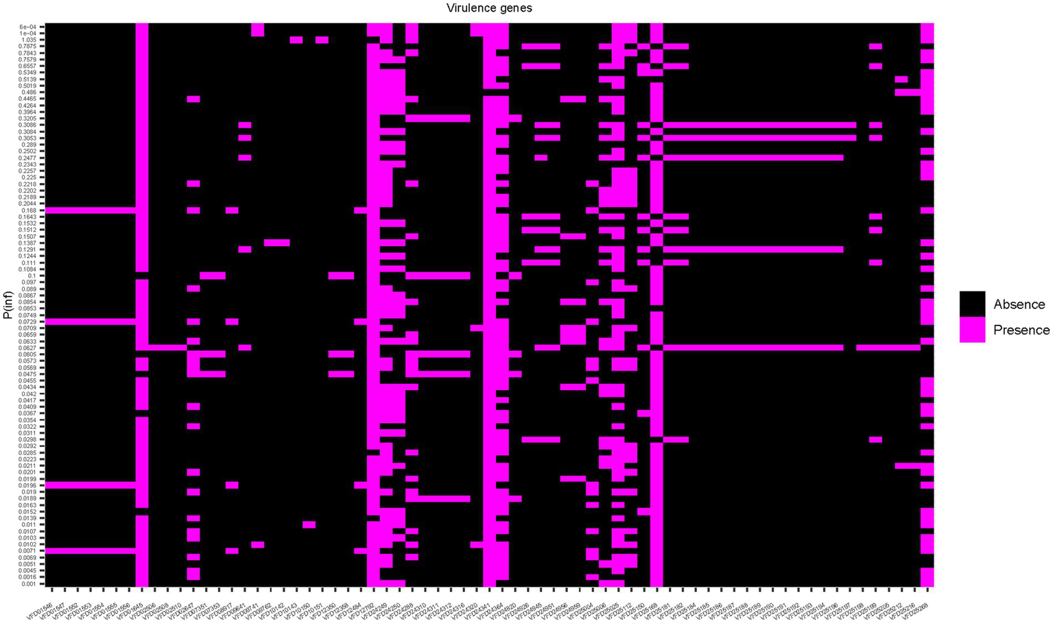 Heat map showing the presence/absence of genes for each isolate. Strains are ranked on the Y-axis according to the mean P(inf) values.