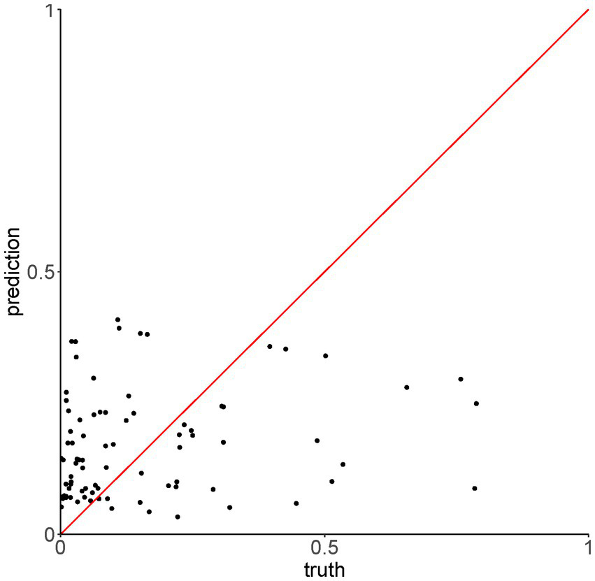 To assess whether the mean value of P(inf) could be predicted by the presence/absence of specific genes, a Random Forest (RF) model was applied. First, presence/absence of virulence genes was plotted against the mean values of P(inf) for each isolate (Figure 4). No evident pattern(s) were found to link the presence of a given virulence gene(s) and the mean P(inf) of the isolates. The percentage of variance explained for the RF model run in regression mode with 10.000 trees was essentially 0. This low score indicated that the virulence genes were very poor predictors of the mean value of P(inf). This was also confirmed by plotting the out of bag (OOB) predictions versus the true mean values of P(inf) (Figure 5).