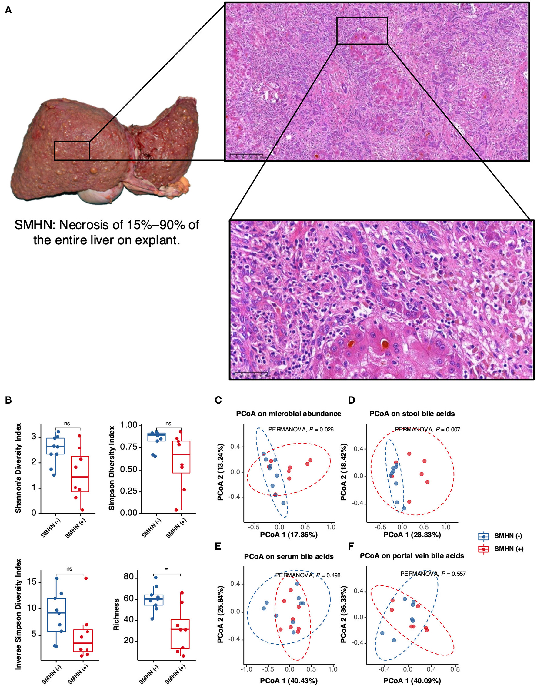 Multi-omic characteristics in SMHN(-) versus SMHN (+). (A) Alpha diversity in SMHN(-) and SMHN (+) patients. *P < 0.05. (B–E) Principal coordinates analysis (PCoA) based on bacterial signatures, stool BAs, serum BAs, and portal vein BAs (Bray–Curtis distance).