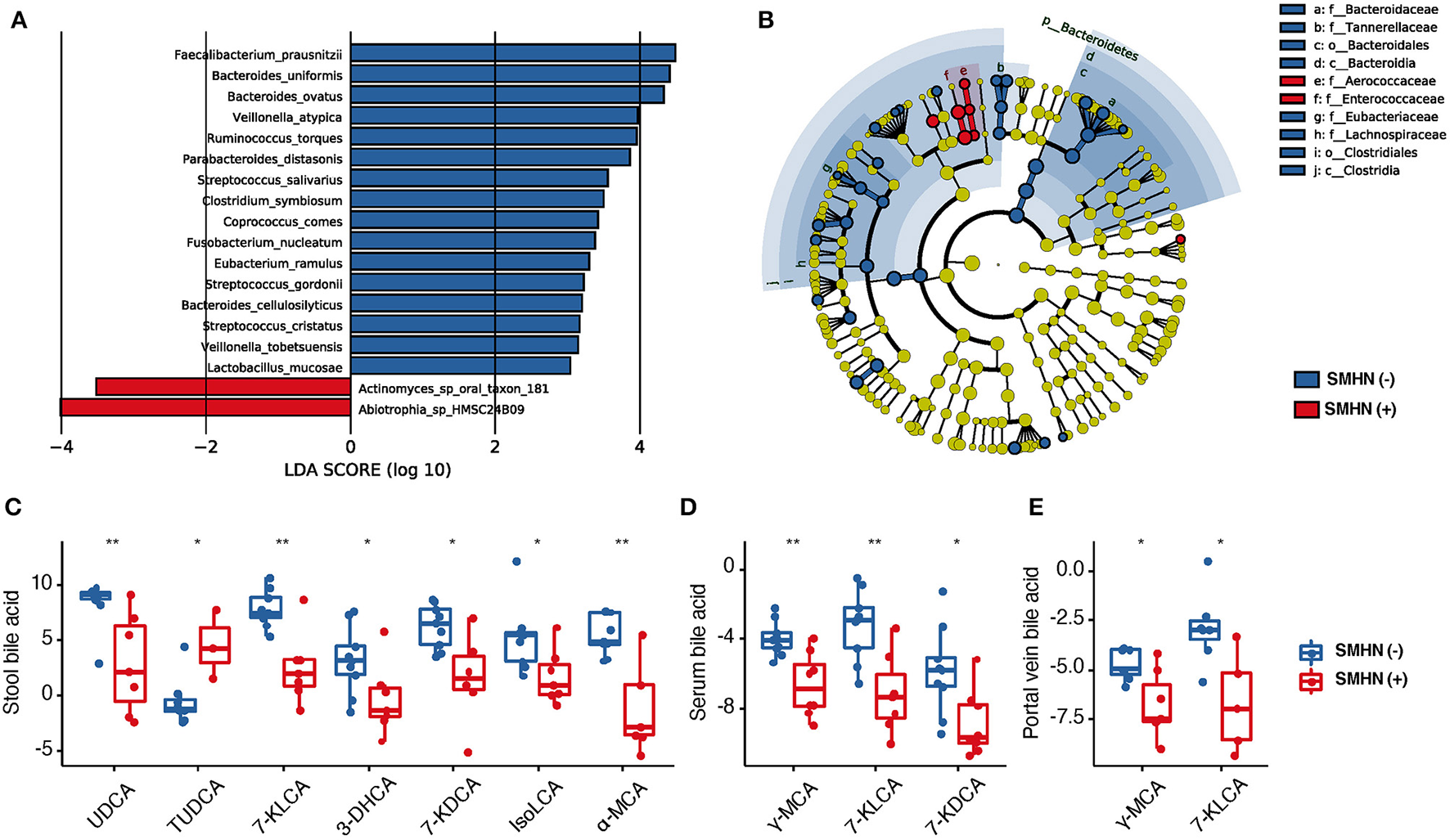 The bacterial species, portal vein BAs, serum BAs, and fecal BAs that discriminate SMHN(-) from SMHN (+). (A) LDA analysis showed significant bacteria species differences between SMHN(-) and SMHN (+). (B) A cladogram of different taxonomic compositions in SMHN(-) and SMHN (+). (C–E) Significant different BAs in stool, serum, and portal vein. *P < 0.05; **P < 0.01.