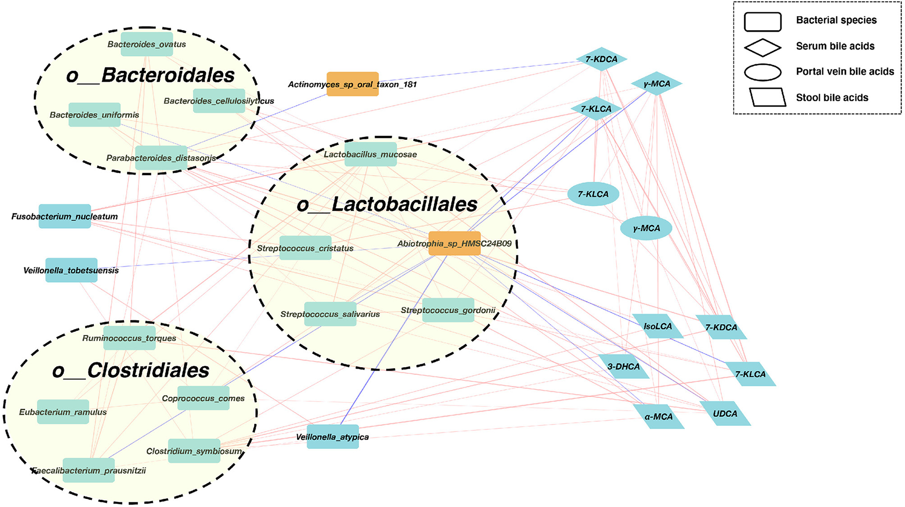 We further found that Abiotrophia_sp_HMSC24B09 enriched in the SMHN (+) group exhibited negative correlations with four bacterial species (Bacteroides uniformis, Streptococcus salivarius, Faecalibacterium prausnitzii, and Veillonella atypica) and five BAs (7-KLCA and γ-MCA in serum, 7-KLCA, UDCA, and α-MCA in stool). Another depleted species in the SMHN(-) group was Actinomyces_sp_oral_taxon_181, which was negatively correlated with Parabacteroides distasonis and 7-KDCA in serum.