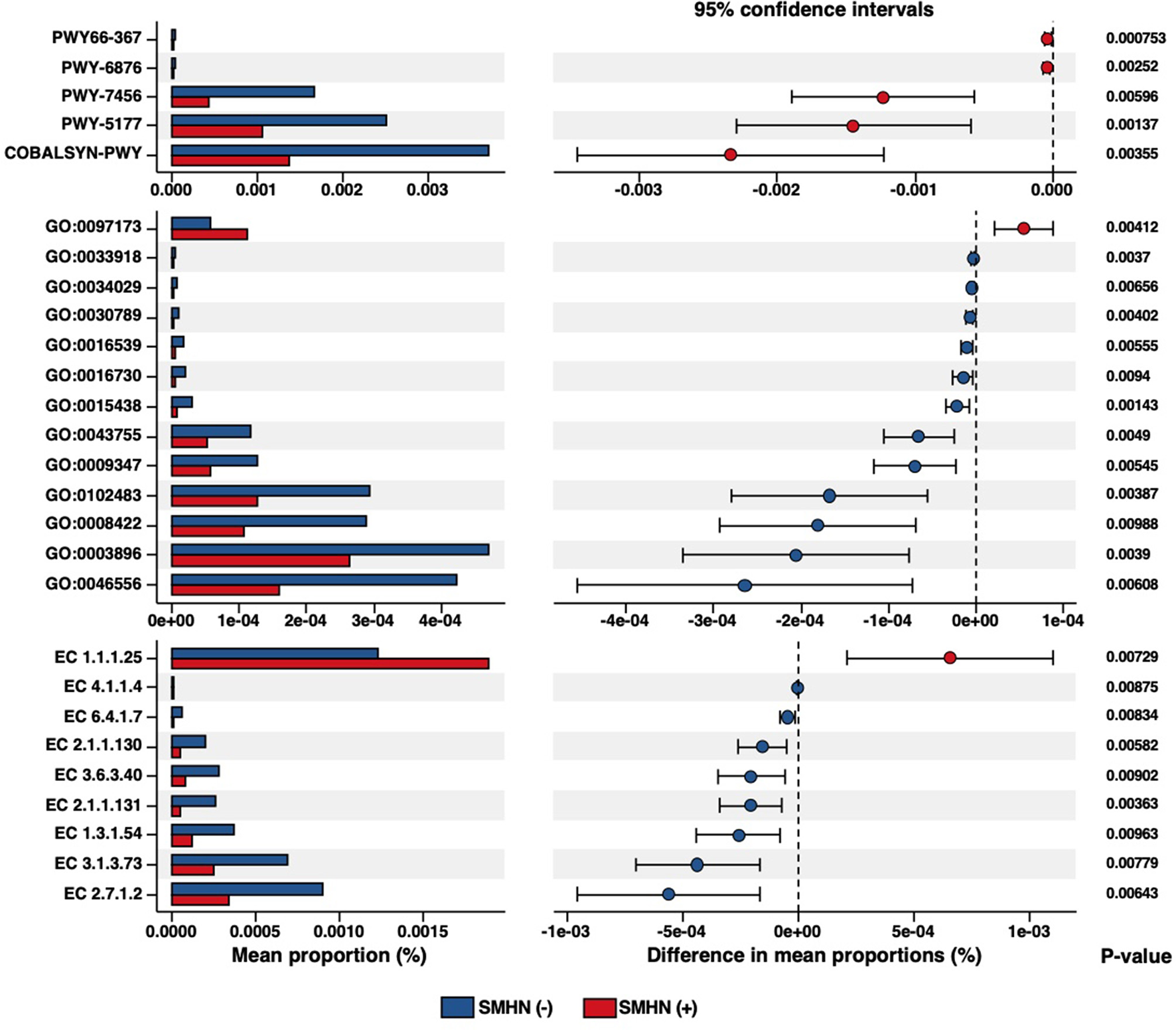 The differential MetaCyc pathways were mainly involved in Ketogenesis (PWY66-367), isopropanol biosynthesis (PWY-6876), β-(1, 4)-mannan degradation (PWY-7456), glutaryl-CoA degradation (PWY-5177), and adenosylcobalamin salvage from cobinamide I (COBALSYN-PWY). Compared with SMHN (+) patients, SMHN(-) patients were characterized by 10 enriched GO molecular function terms. The N-acetylmuramic acid catabolic process (GO: 0097173) displayed enrichment in SMHN (+) patients, and intein-mediated protein splicing (GO: 0016539) displayed enrichment in SMHN(-) patients.