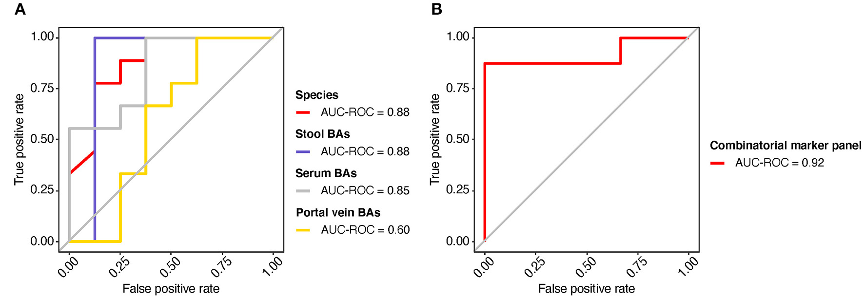 Predicting the SMHN status from multi-omic features. (A) ROC curves for the models based on bacterial species, stool BAs, serum BAs, and portal vein BAs. (B) ROC curve for the combinatorial marker panel.