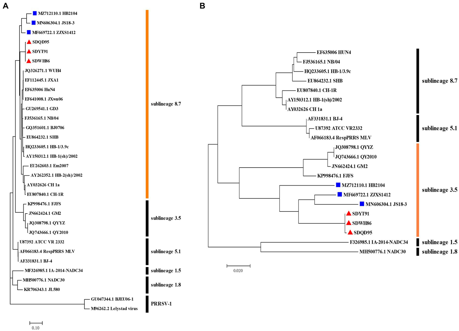 Figure 4. Phylogenetic analysis of the whole genome and ORF3 gene of new-branch PRRSV. (A) Phylogenetic tree constructed based on the whole genome of new-branch PRRSV isolates and reference strains from different sublineages; (B) Phylogenetic tree constructed based on the ORF3 gene of new-branch PRRSV isolates and reference strains from different sublineages. The new branch PRRSV strains obtained in this study are labeled with red triangles (▲). The strains obtained from GenBank belonging to the new branch are marked with blue squares (■).