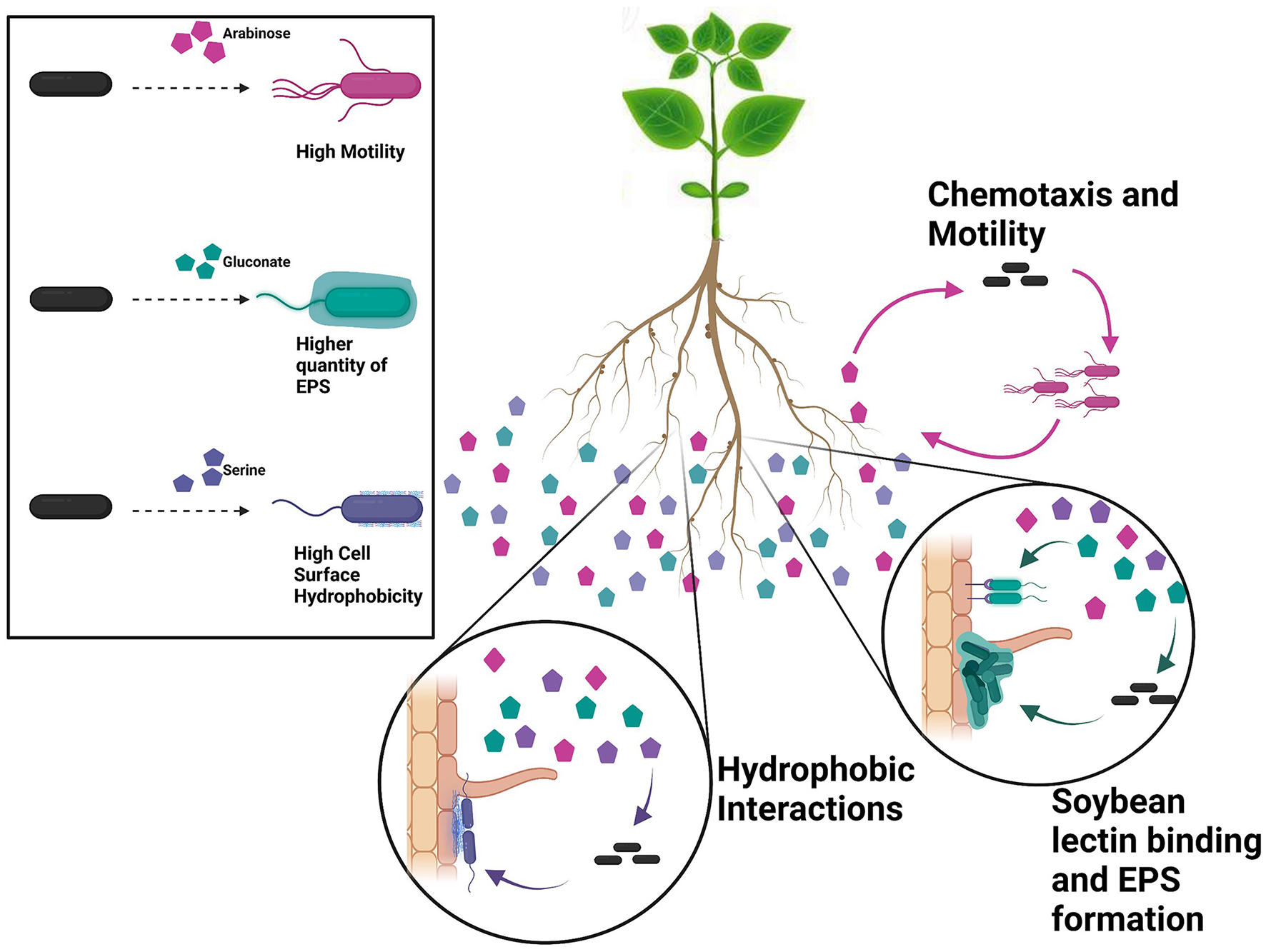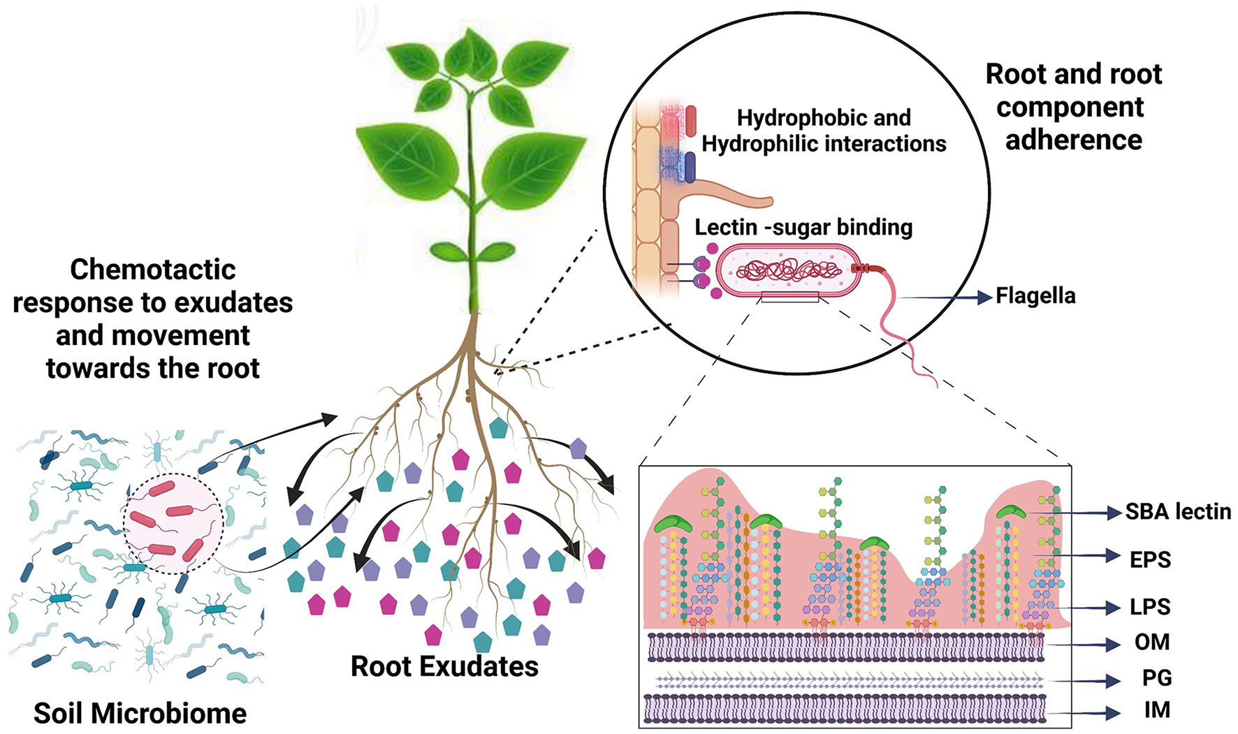 Root colonization is a multiphase process involving the translocation of bacteria from soil to the root and adherence to the root surface. Bacterial cells are chemotactically attracted by root exudate compounds and use their flagella to drive root-directed movement. For root adherence, bacteria use hydrophobic interactions and surface sugars. Subsequently, microcolony formation is moderated by extracellular polymeric substances. We compared phenotypic traits that play role in root attachment under the influence of soybean root exudate compounds, to understand the role of each in root attachment. SBA, soybean agglutinin lectin; EPS, extracellular polymeric substances; LPS, lipopolysaccharides; OM, outer membrane; PG, peptidoglycan; IM, inner membrane.