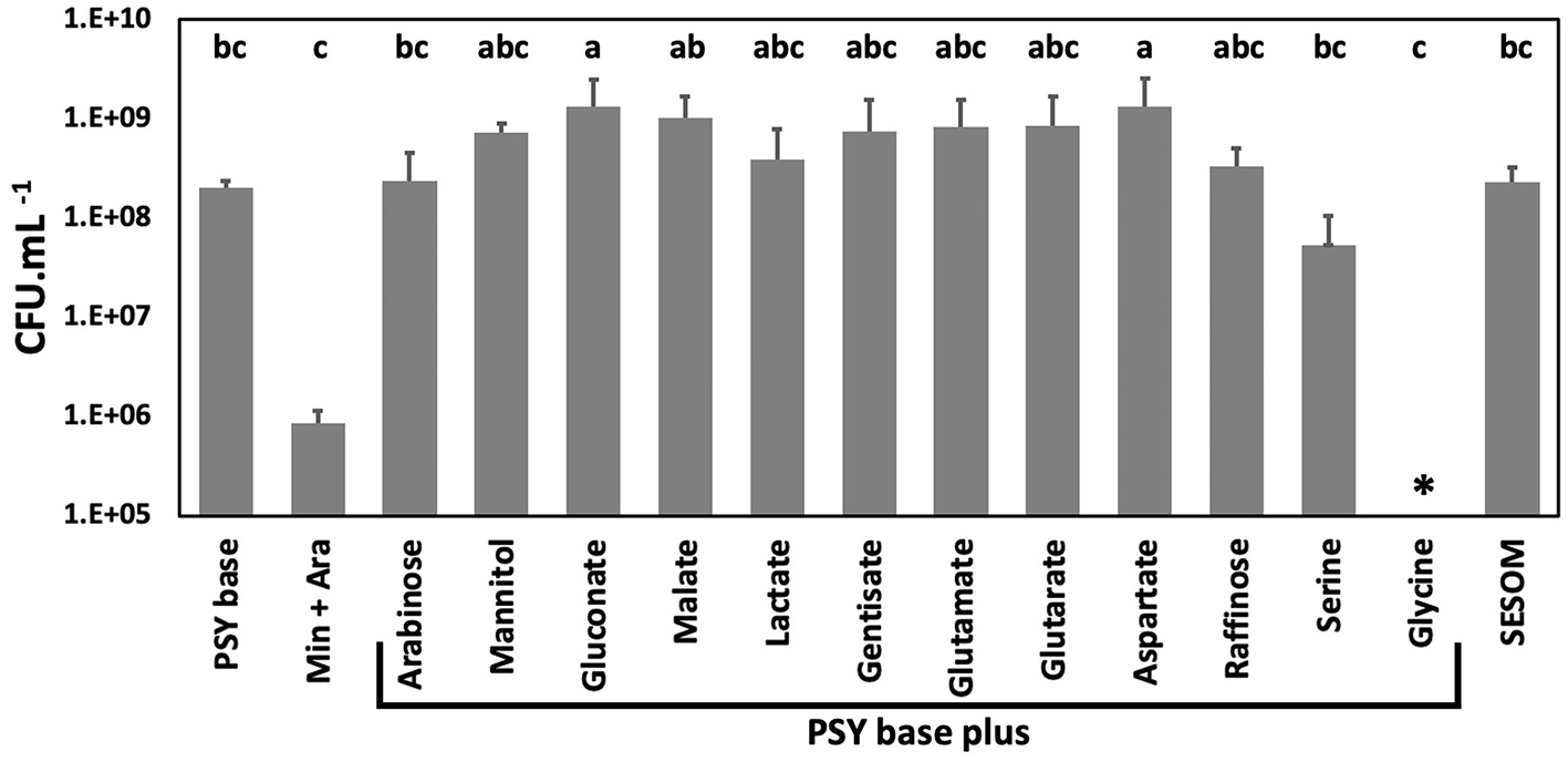 To determine biomass yield, USDA110 was inoculated into PSY base and PSY base without peptone and yeast extract supplemented with ammonium chloride (Min + Ara). PSY base without peptone and yeast extract and with arabinose as a carbon source supported limited growth as compared to the PSY base alone (Figure 2). Therefore, PSY base instead of the minimal medium was used for phenotype analysis to confirm that the observed phenotype is because of the effect of the root exudate and not because of growth limitations. For this study, the PSY base was supplemented with 11 RECCs individually, reported to be predominant in soybean root exudate (Timotiwu and Sakurai, 2002; Tawaraya et al., 2014; Shinano et al., 2020), and mannitol, a widely used carbon source for Bradyrhizobium. Bulk soil nutritional conditions were mimicked using a filter-sterilized soybean soil extract, SESOM. Biomass yield was similar across all carbon sources except for a lower yield on serine, while glycine did not support growth (Figure 2). The biomass yield was lower in PSY-glycine than PSY alone, suggesting that glycine inhibits the growth of USDA 110.