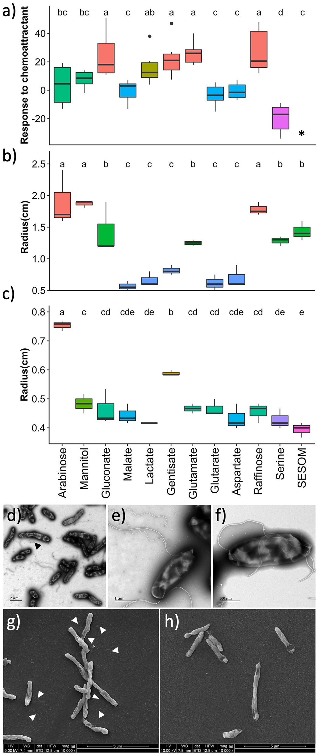 Motility of B. diazoefficiens USDA 110 growing in soybean root exudate compounds, measured by (a) chemotaxis, (b) swimming, and (c) swarming. Transmission electron microscopy of cells grown in arabinose with the black arrow pointing to a lateral flagellum (d, e), and of cells grown in gentisate (f). Scanning electron microscopy of cells grown in arabinose with white arrows pointing to flagella (g), and of cells grown in soil-extracted soluble organic matter (SESOM) (h). *Chemotaxis could not be measured in SESOM due to the autofluorescence of the medium.