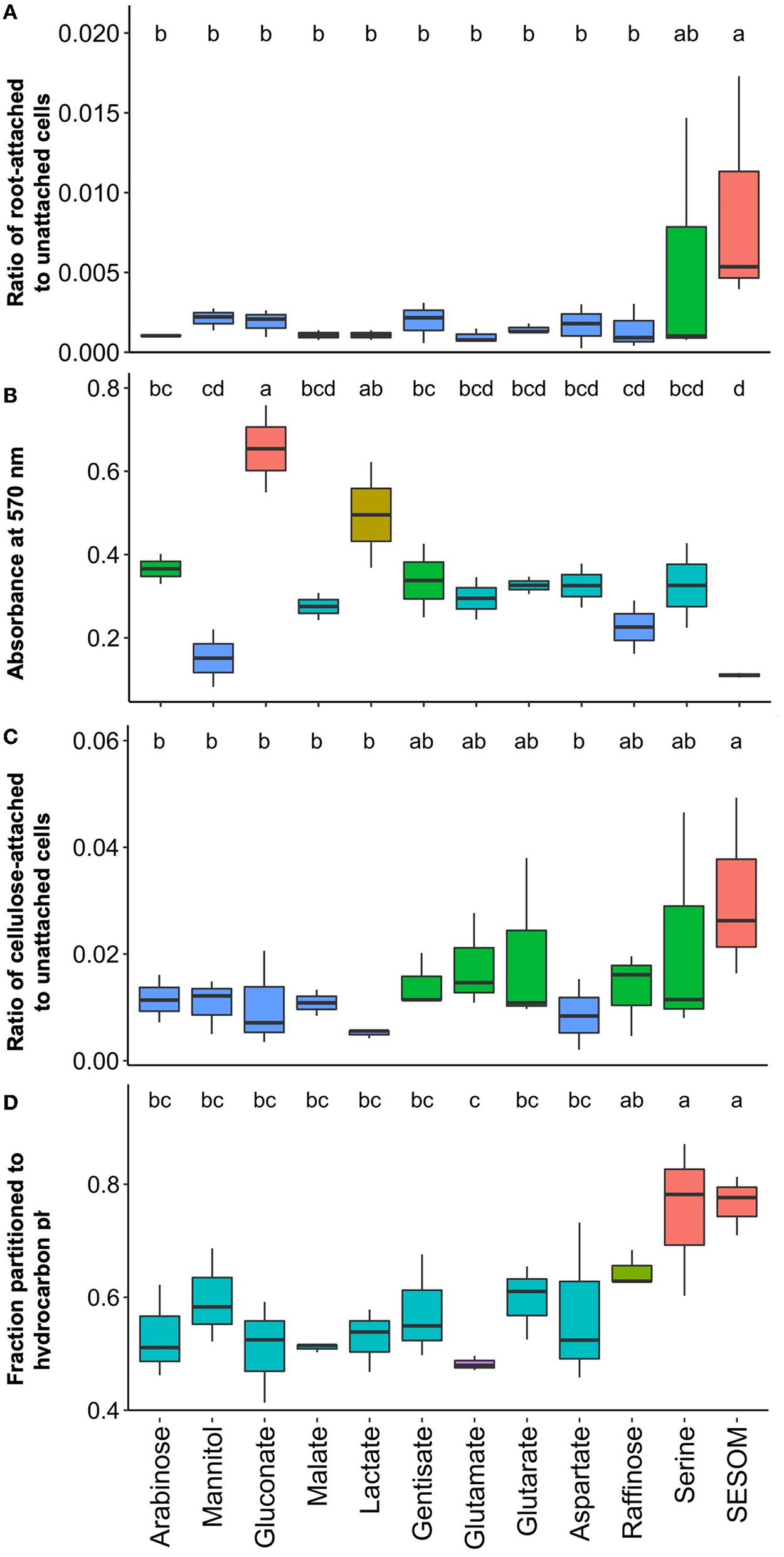 Our data indicate that USDA 110 is sensitive to its nutritional surroundings and alter its surface-related properties accordingly. Individual root exudates have a significant effect on the specific cell surface properties. For instance, arabinose promotes motility, gluconate promotes EPS formation, and serine increases bacterial cell surface hydrophobicity (panel at left). Root exudate exposure leads to diverse surface-related phenotypes, influencing root adherence. As individual bacteria encounter pockets of specific root exudate compounds, they will likely adapt their surface phenotype, e.g., becoming hydrophobic or expressing specific surface sugars. The bacterial phenotypic plasticity points to one mechanism of how plant–microbe interaction is influenced by plant root exudates and that individual RECCs play a specific role at different stages of root attachment.