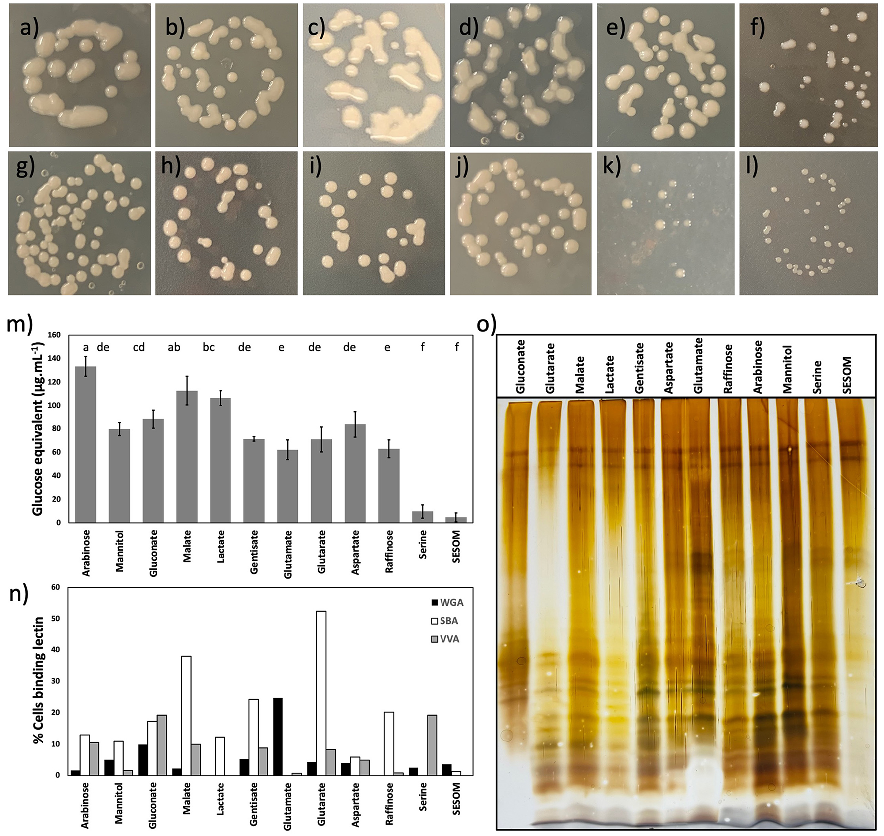 Colony morphology of B. diazoefficiens USDA110 on PSY agar supplemented with arabinose (a), mannitol (b), gluconate (c), malate (d), lactate (e), gentisate (f), glutamate (g), glutarate (h), aspartate (i), raffinose (j), serine (k), and soil-extracted soluble organic matter (SESOM) (l). Surface saccharides of B. diazoefficiens USDA 110 grown in liquid culture (m), and binding of soybean agglutinin, wheat-germ agglutinin, and VVA to exponential phase liquid cultures (n). Lipopolysaccharide profiles of populations grown in the liquid culture (o).