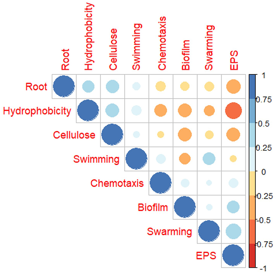 To understand the relation of the root adherence ability of USDA 110 with other surface properties across the 12 RECC, we calculated Pearson's correlation coefficient. Observations from all the adherence and phenotypic properties from all the carbon sources were used to study the correlation. As observed in Figure 6, root adherence ability correlated positively with cellulose attachment and cell surface hydrophobicity of the Bradyrhizobium. In contrast, root adherence negatively correlated with the exopolysaccharide quantity and biofilm formation ability. The motility-related properties, including swimming, swarming, and chemotaxis seemed to have minor or no relation to the root attachment ability of USDA 110. Another important observation was that exopolysaccharide and hydrophobicity were highly negatively correlated with one another. Both biofilm formation and EPS quantity are often linked to nodule formation ability but were negatively correlated to almost all the other adherence-related properties except for themselves.