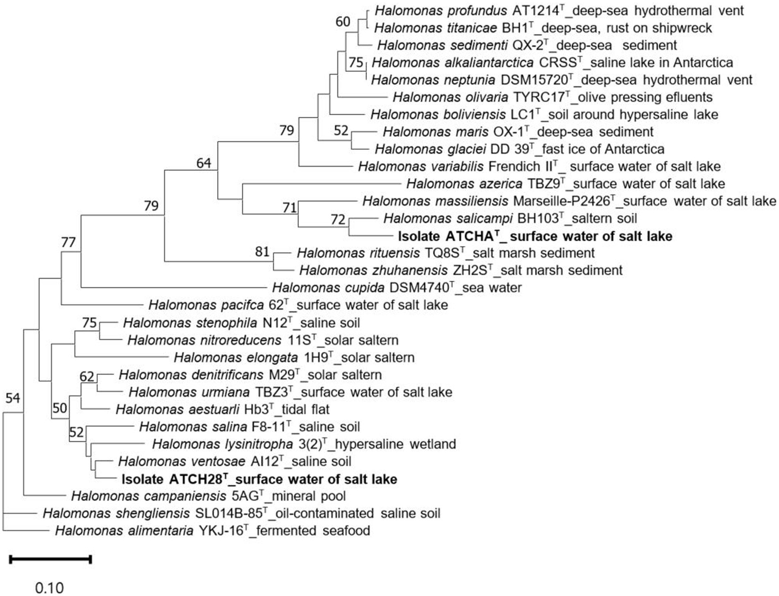 Maximum likelihood trees inferred from 81 single-copy core genes, demonstrating the relationship among ATCHAT, ATCH28T, and other type species within Halomonas. The source of isolation is shown at the branch tips. Only gene support indices greater than 50% are given at the branch points. The scale bar represents substitutions per nucleotide position.