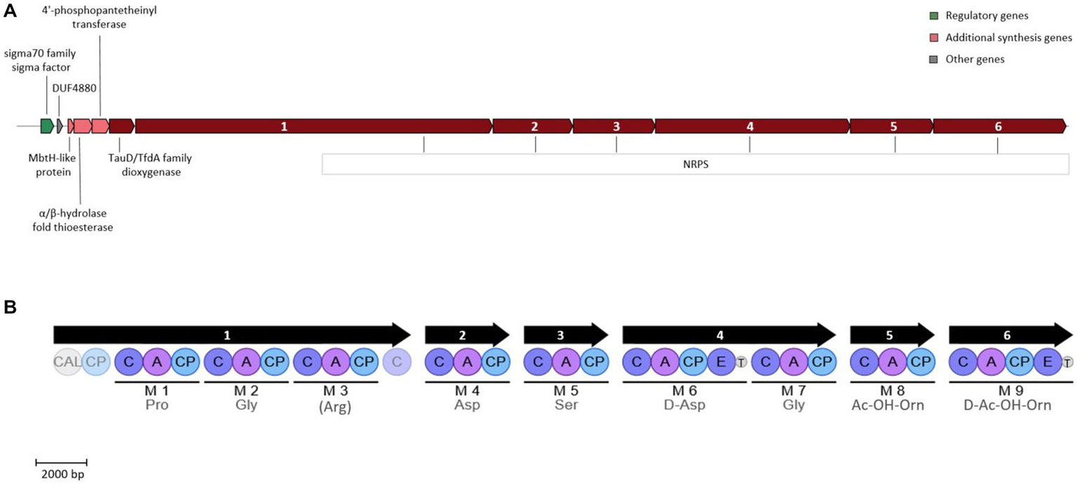 Siderophore biosynthetic gene cluster (A) and encoded NRPS modules (B) present in strain ATCHAT. The color blocks (A) represent different categories based on the AntiSMASH output. Numbers within NRPS genes indicate genes encoding the corresponding modules. Modules are indicated by black lines with predicted amino acids below. For amino acids in parenthesis, only 80% of the signature sequence matched the Stachelhaus code. Light shaded circles represent domains outside of modules. CAL, coenzyme A ligase domain; C, condensation domain; A, AMP binding domain; CP, peptidyl carrier protein domain; T, domain TIGR01720 of unknown function.