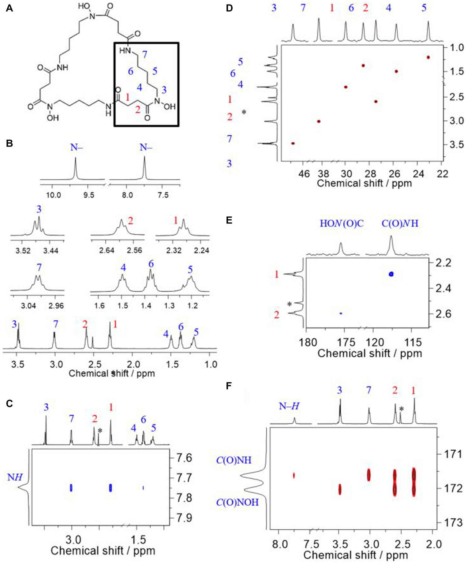 1H NMR spectra (conventional or using either Carr-Purcell-Meiboom-Gill (CPMG) pulse train or water signal suppression by pre-saturation, respectively) were recorded with an acquisition time of 1 s after applying a 2.8 μs (π/6) pulse, upon accumulation of 16 scans using 3 s relaxation delay. H,C-HSQC (heteronuclear single-quantum coherence) and H,C-HMBC (heteronuclear multiple-bond correlation) sequences applied gradient-selection and adiabatic pulses, acquiring 2 k × 512 and 2 k × 1 k complex points in F2 and F1, 48 transitions per F1 increment, with a relaxation delay of 1 s, respectively. For polarization transfer, (2 J)−1 delays of 4.0 and 62.5 ms were opted, corresponding to 125 Hz 1J in HSQC and 8 Hz nJ in HMBC, respectively. H,N-HSQC and H,N-HMBC sequences applied gradient-selection and adiabatic pulses, acquiring 2 k × 256 and 2 k × 128 complex points in F2 and F1, 88 transitions per F1 increment, with a relaxation delay of 1 s, respectively. For polarization transfer, (2 J)−1 delays of 5.6 and 41.7 ms were opted, corresponding to 90 Hz 1J in HSQC and 12 Hz nJ in HMBC, respectively. For homonuclear scalar and dipolar coupling detection, gradient-selected versions of 1H,1H-correlation spectroscopy (COSY) and rotating-frame Overhauser-enhancement spectroscopy (ROESY) experiments were performed upon acquisition of 2 k × 256 complex points in F2 and F1, 8 or 16 transitions per F1 increment, with relaxation delay of 1 s, respectively. ROESY mixing time was 200 ms. 1H and 13C as well as 15N chemical shift values are reported in ppm relative to internal TMS as well as external liquid ammonia, respectively.
