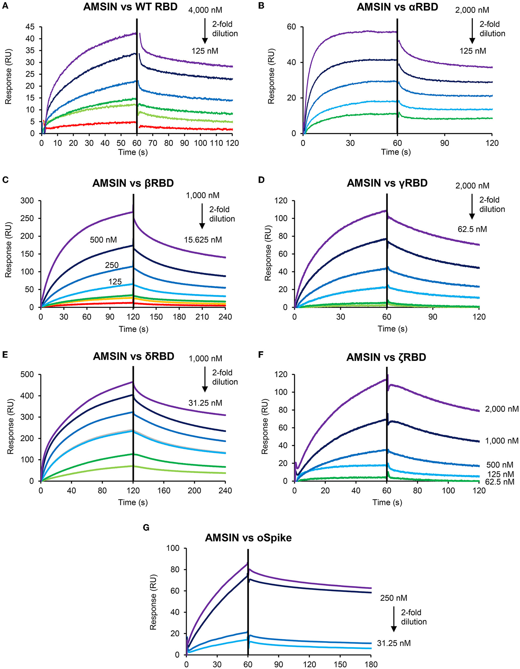 Figure 2. Sensorgrams of SARS-CoV-2 RBD binding to the AMSIN-immobilized chip surface. The concentrations with 2-fold serial dilutions are shown here. In this SPR experiment, AMSIN as the ligand was covalently immobilized onto CM5 via its amine groups, and the analytes (various RBDs) flowed over the surface. (A) WT RBD; (B) αRBD; (C) βRBD; (D) γRBD; (E) δRBD; (F) ζRBD; and (G) oSpike.