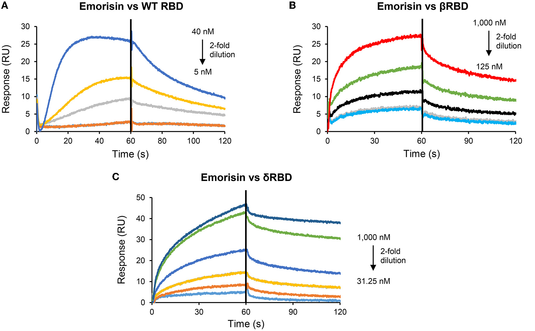 Figure 3. Sensorgrams of SARS-CoV-2 RBD binding to the emorisin-immobilized chip surface. The concentrations with 2-fold serial dilutions are shown here. In this SPR experiment, emorisin as the ligand was covalently immobilized onto CM5 via its amine groups, and the analytes (various RBDs) flowed over the surface. (A) WT RBD; (B) βRBD; and (C) δRBD.