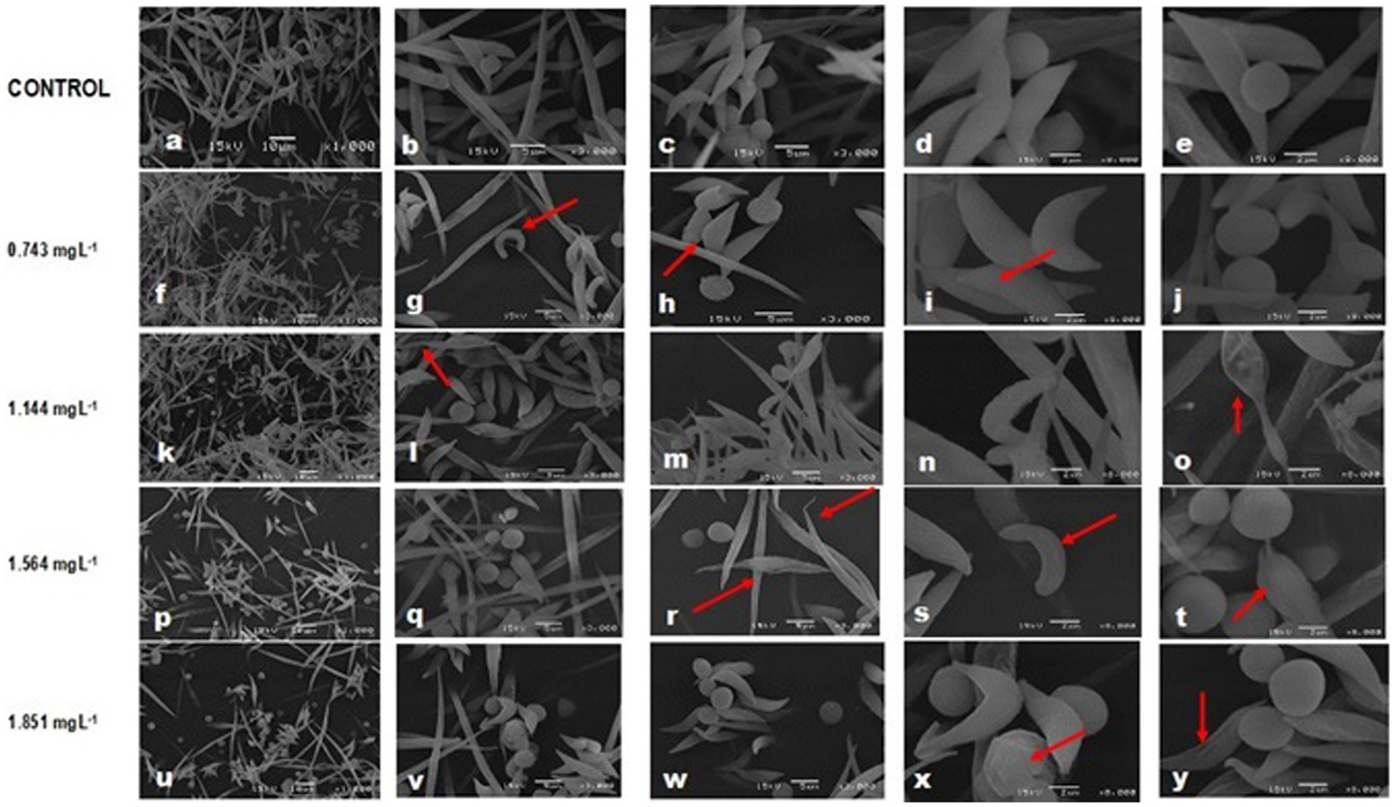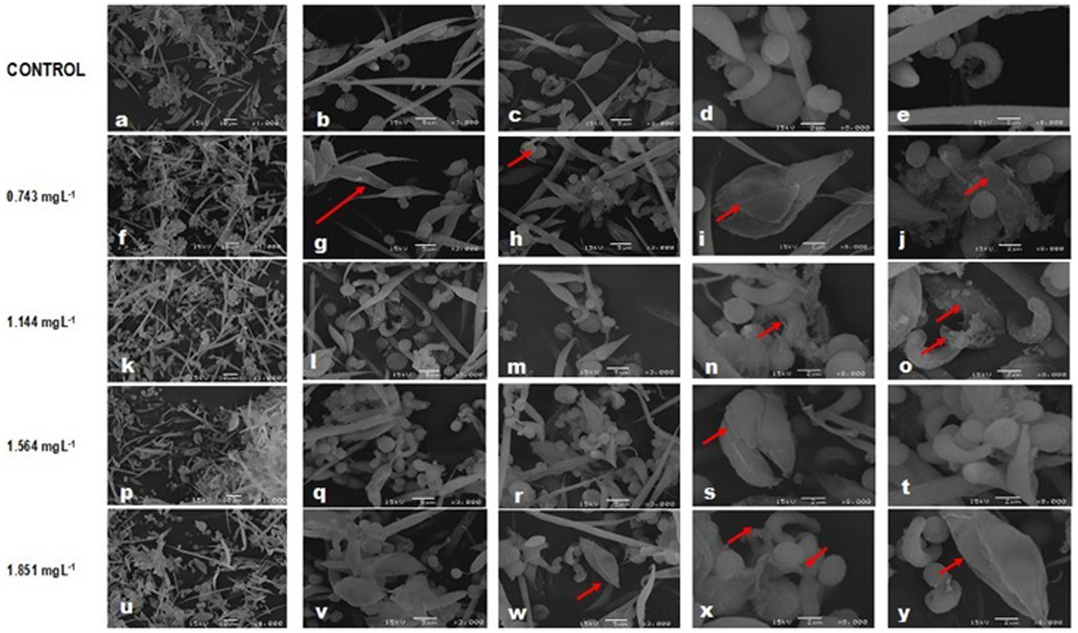SEM images showing affectations in the cell morphology of a community of microalgae and cyanobacteria after exposure to glyphosate (Faena®) during 96 h at sub-inhibitory concentrations, IC40 of each species. (a–e) all microalgae species showed morphological alterations probably due to the actions of cyanotoxins. (f–j) Damage is mainly evident in the cell wall. (p–y) Desquamation of the cell wall, loss of the typical shape, and change in the biovolume.