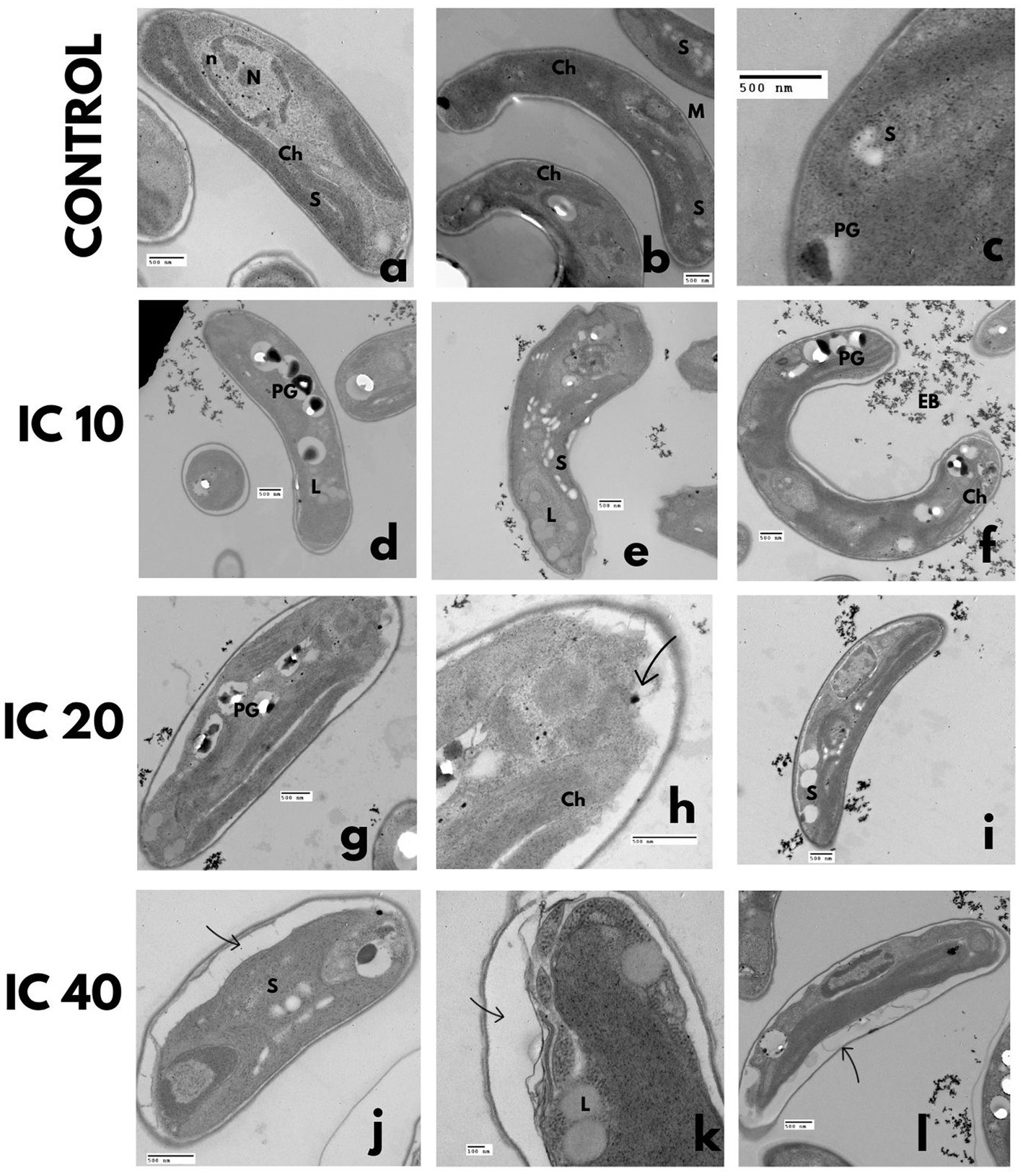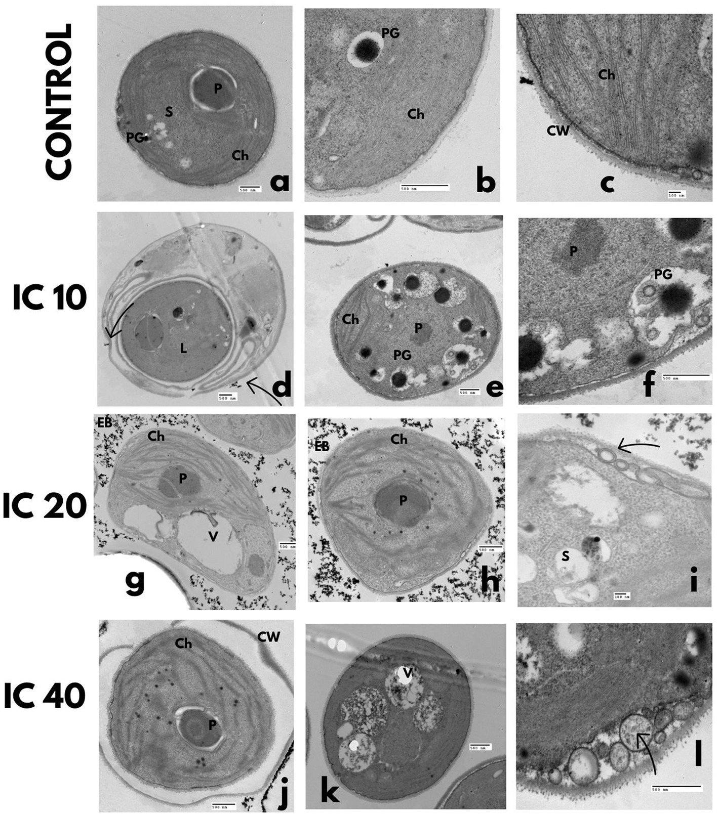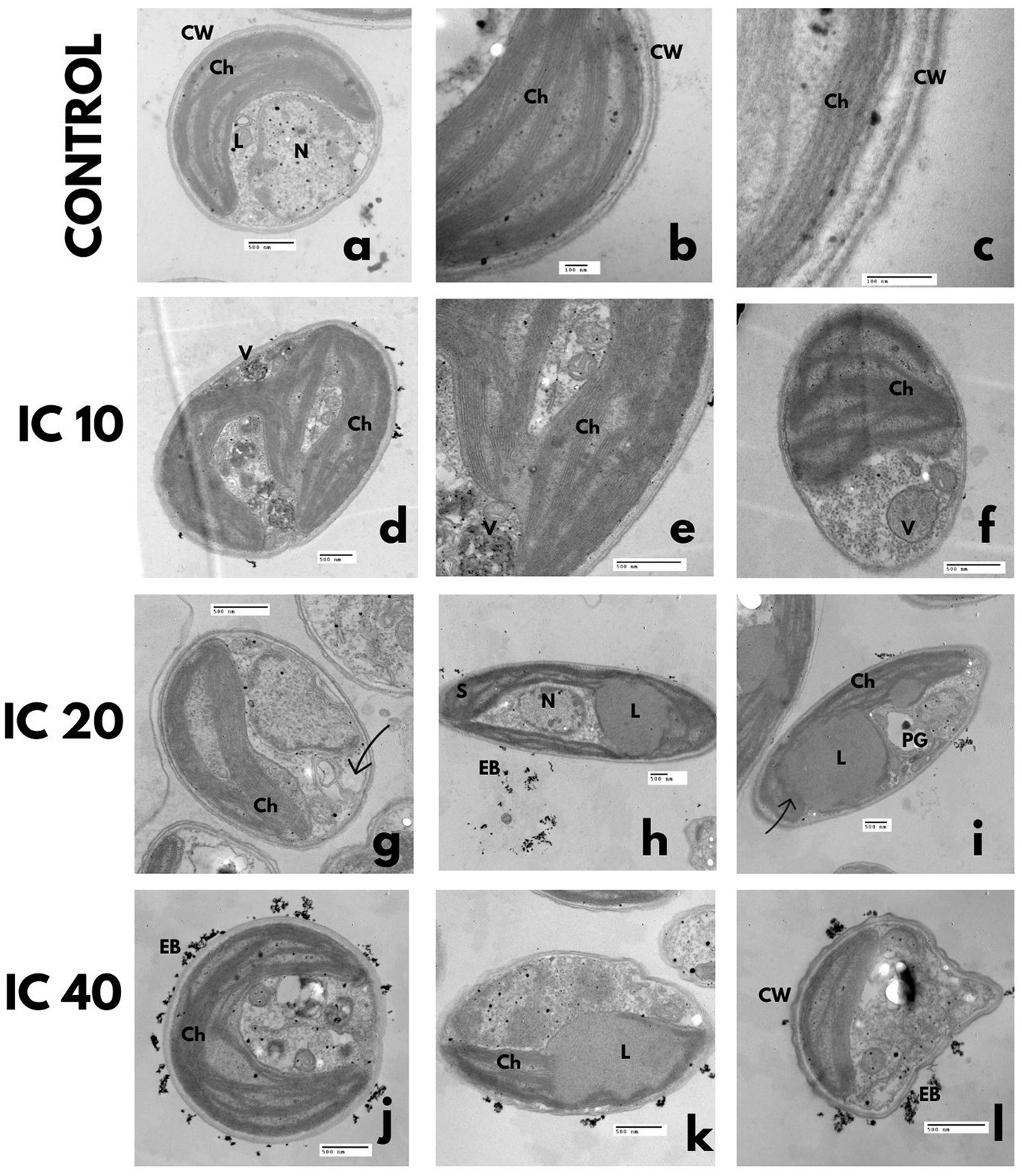 TEM microphotographs. C. vulgaris after Faena® exposure during 96 h at sub-inhibitory concentrations (IC10, IC20, and IC40). (a–c) Control, (d–f) lipid vesicles and polyphosphate granules, (g–i) disorganized chloroplasts and vesicles between the membrane and the cell wall, (J–L) rupture of the cell wall and deposition of electrodense bodies inside the cell. Observed structures: chloroplasts (Ch), pyrenoids (P), vacuoles (V), electrodense bodies (EB), starch granules (S), nucleus (N), nucleolus (n), polyphosphate granules (PG), lipid vesicles (L), and cell wall (CW).