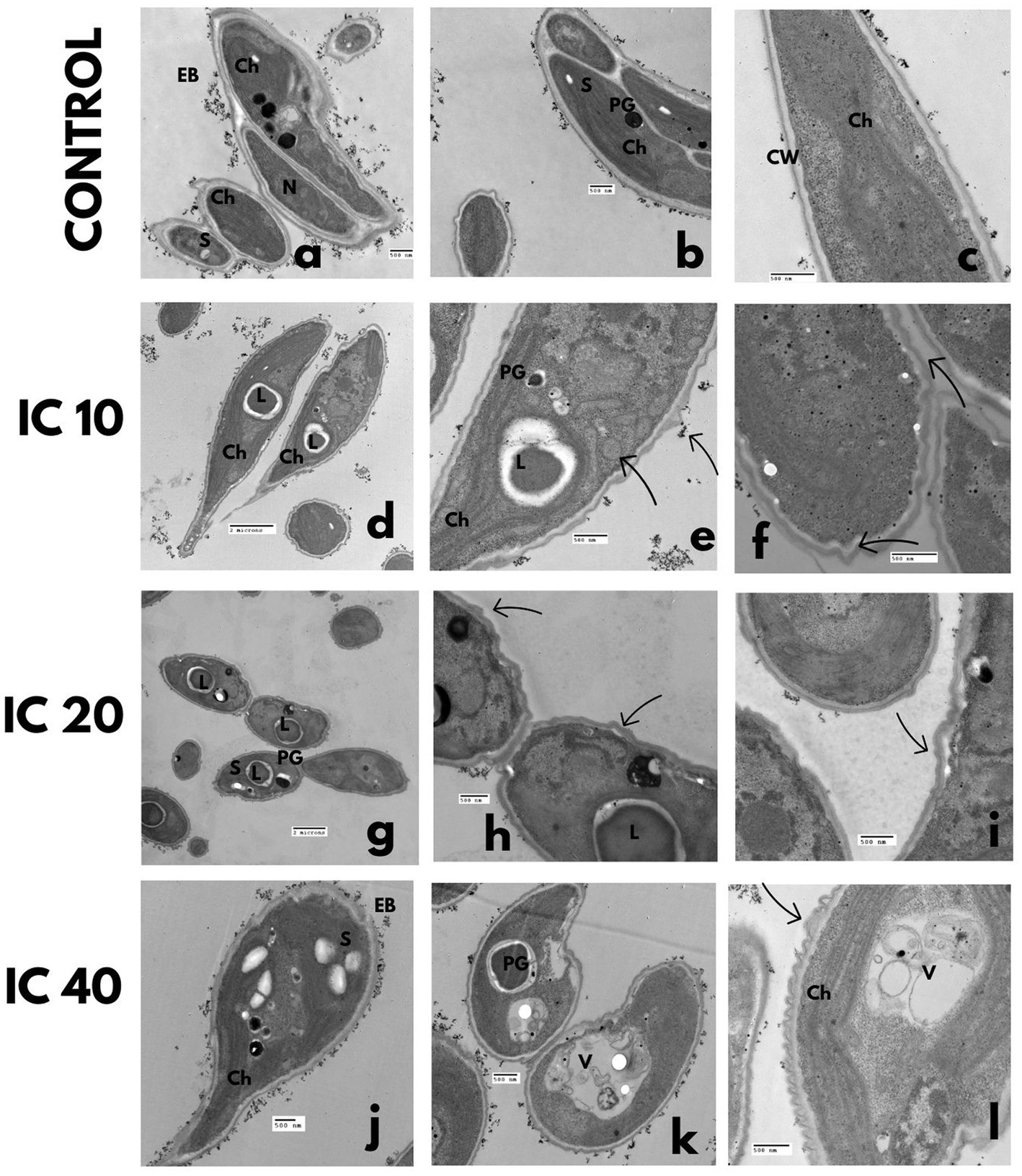 Ultrastructural changes of S. incrassatulus. TEM microphotographs after exposure to Faena® during 96 h at sub-inhibitory concentrations (IC10, IC20, and IC40). (a–c) Control, (d–f) lipid vesicles and folding of the cell wall, (g–i) loss of cell wall continuity and lipid vesicles, (j–l) damage to the chloroplast, and loss of the typical shape. Observed structures: chloroplasts (Ch), vacuoles (V), electrodense bodies (EB), starch granules (S), nucleus (N), polyphosphate granules (PG), lipid vesicles (L), and cell wall (CW).