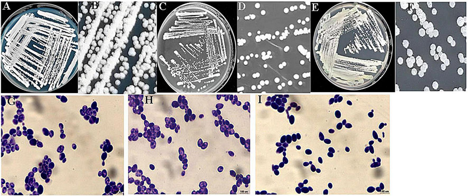 Colony and cell morphologies of ethanol-tolerant non-Saccharomyces yeasts isolated from R. Roxburghii. (A,B) Colony morphology of C6 on WL medium; (C,D) colony morphology of F112 on WL medium; (E,F) colony morphology of F15 on WL medium; (G) cell morphology of C6 following crystal violet staining (100×); (H) cell morphology of F112 following crystal violet staining (100×); and (I) cell morphology of F15 following crystal violet staining (100×).
