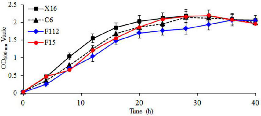 The C6, F112, and F15 strains were inoculated into YEPD broth at a concentration of 108 cfu/ml and cultured under agitation at 180 rpm and 28°C for 48 h. The OD of the cultures was measured at the wavelength of 600 nm every 4 h, and a growth curve was plotted based on the time and OD600nm values.
