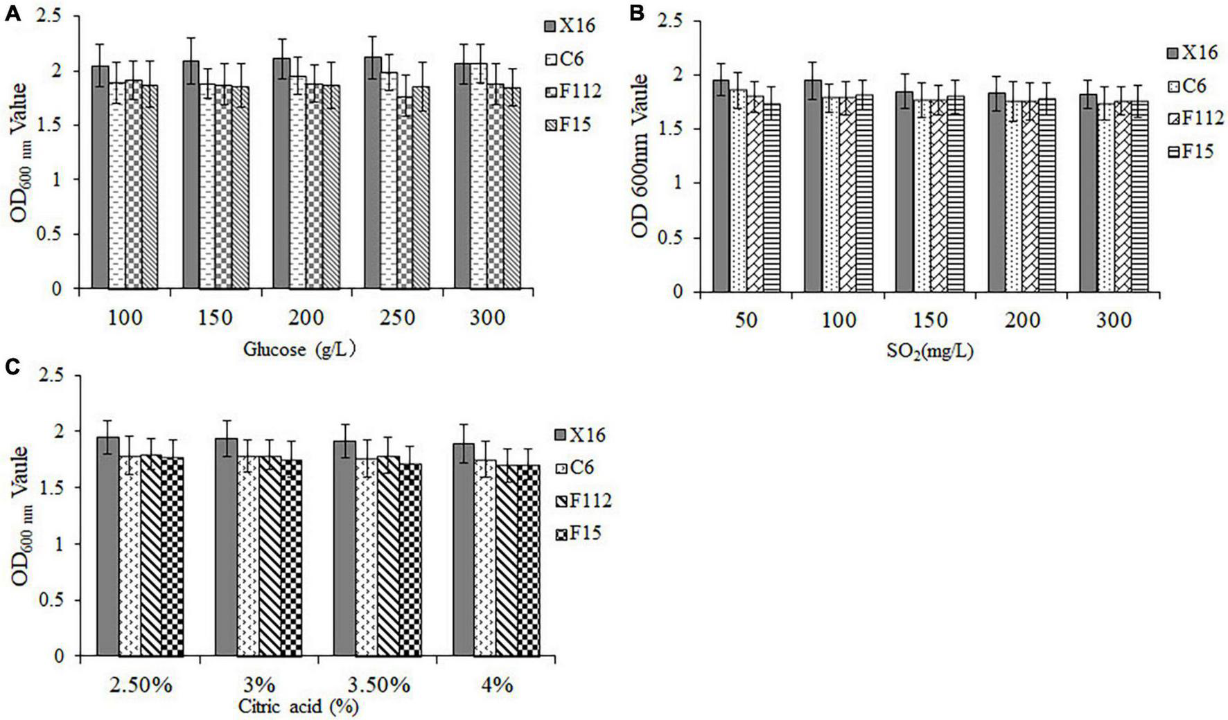 Strains of C6, F112, and F15 were inoculated in YEPD broth at a concentration of 108 cfu/ml with (1) glucose concentrations of 100, 150, 200, 250, or 300 g/L; (2) citric acid mass fractions of 1, 1.5, 2, 2.5, or 3% (w%); and (3) a sulfur dioxide contents of 50, 100, 150, 200, or 300 mg/L. All groups were cultured at 28°C and 180 rpm for 36 h with three replicates, and then OD600nm values were measured.