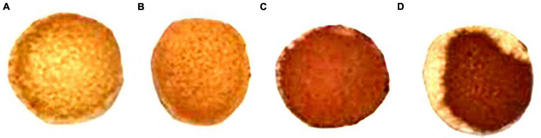 Hydrogen sulfide production ability of C6, F112, and F15 strains on BiGGY agar. (A)S. cerevisiae X16; (B) strain of C. tropicalis C6; (C) strain of P. guilliermondii F112; and (D) strain of W. anomalus F15.
