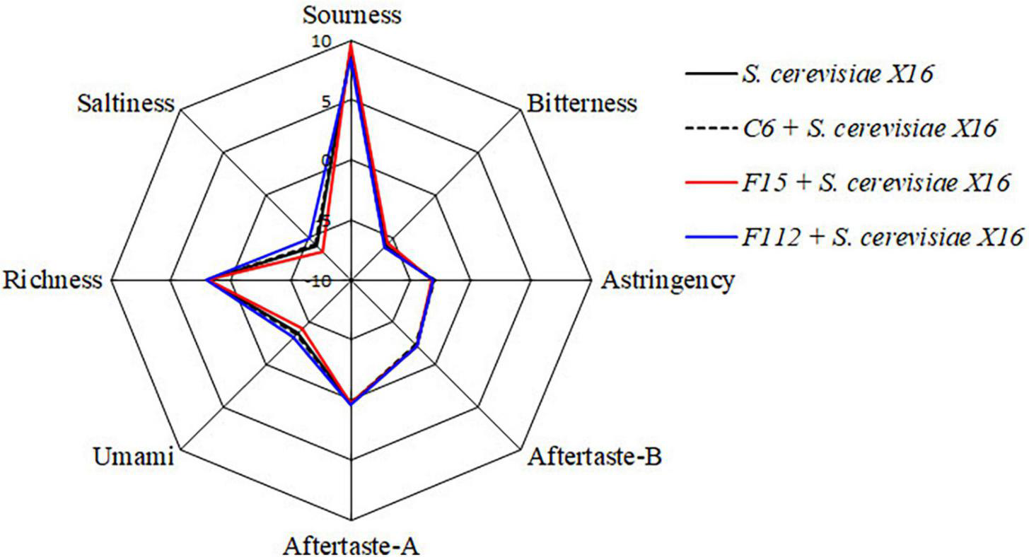 Radar chart of taste attribute of R. Roxburghii wine fermented with ethanol-tolerant non-Saccharomyces yeasts in combination with S. cerevisiae.