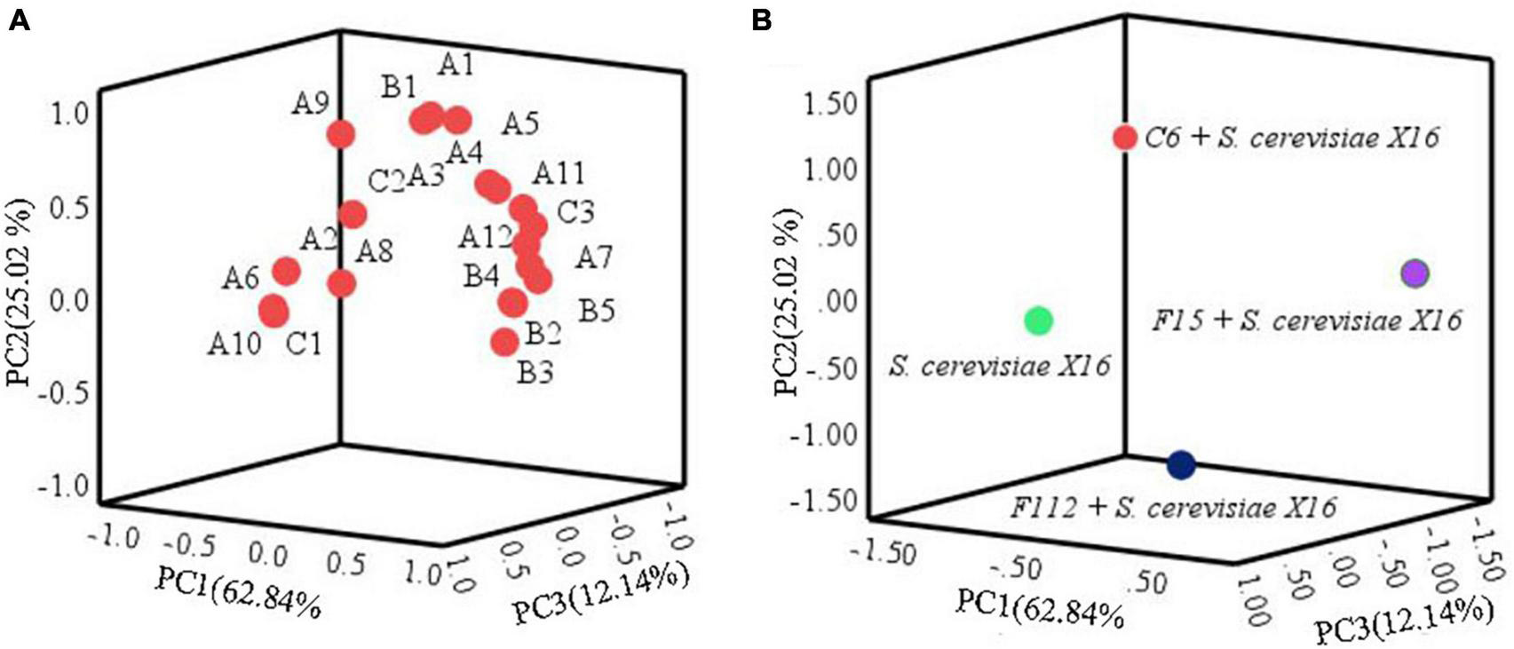The combination of non-saccharomyces yeasts with S. cerevisiae as fermentation starters has been widely studied and accepted in wine production (Comitini et al., 2011). To further analyze the fermentative properties of the ethanol-tolerant yeast strains, R. roxburghii wine was fermented by co-inoculating the C. tropicalis C6, P. guilliermondii F112, or W. anomalus F15 together with S. cerevisiae X16. Dynamic changes of the non-Saccharomyces yeasts population during R. roxburghii wine fermentation were monitored by colony counting method, and the results showed that the proportion of C. tropicalis C6, P. guilliermondii F112, and W. anomalus F15 gradually decreased, in contrast, the proportion of S. cerevisiae X16 gradually increased and dominate at the middle and later periods of fermentation (Supplementary Figure 2).